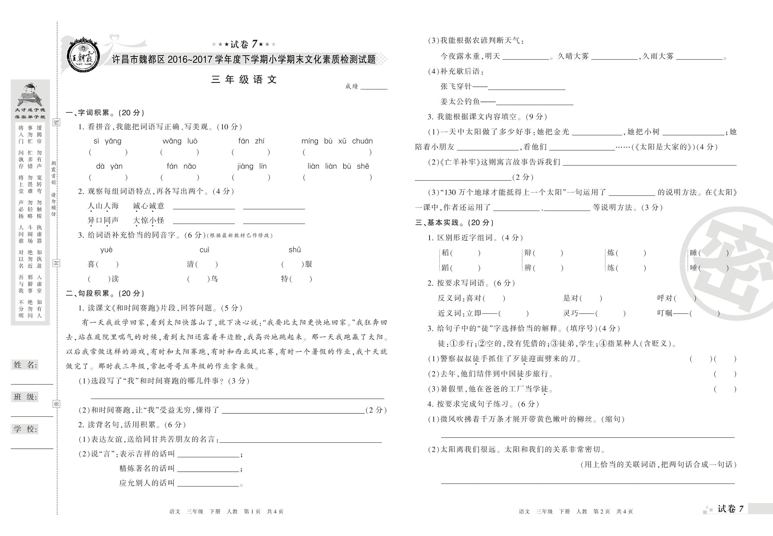 2016-2017学年第二学期许昌市魏都区三年级语文试卷(人教版)【7】