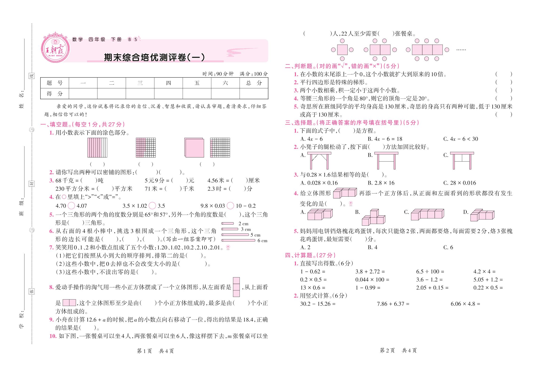 2021下册四年级数学北师版 期末综合培优测评卷(一)