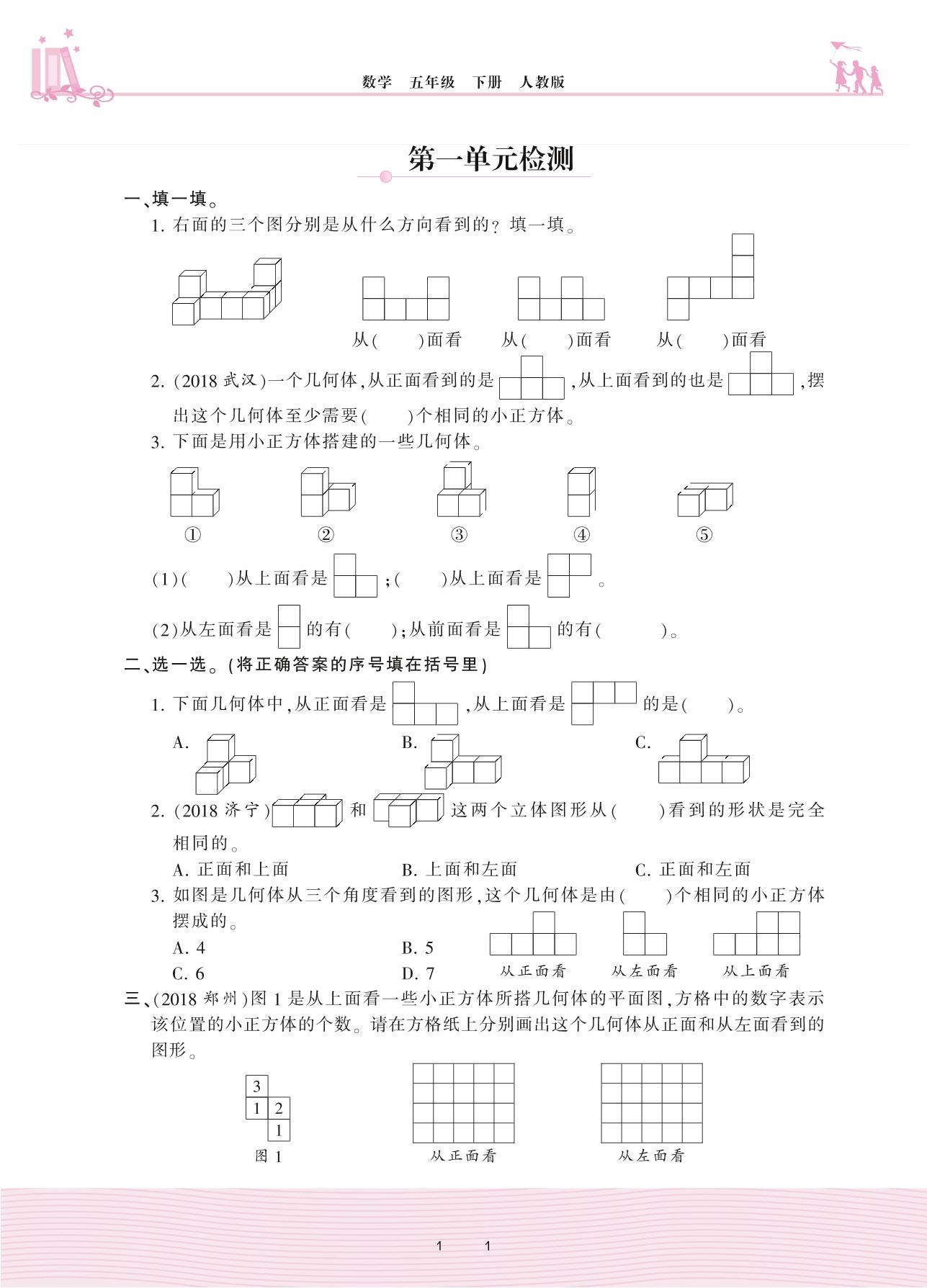2021下册五年级数学人教版 1 观察物体(三)——第一单元检测