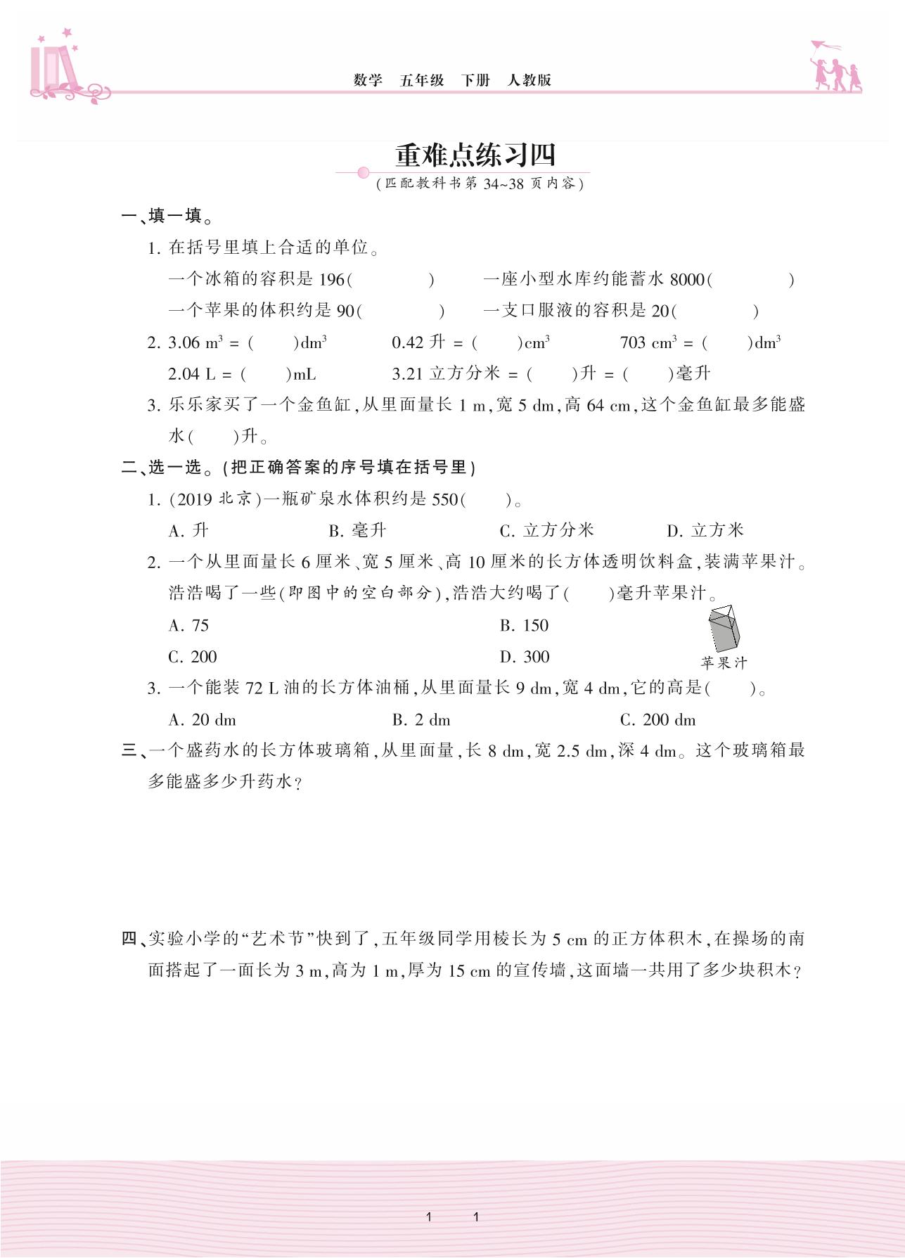 2021下册五年级数学人教版 3 长方体和正方体——重难点练习四