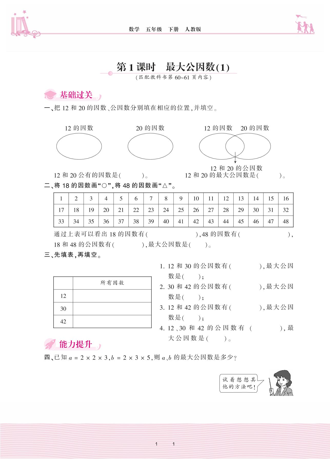 2021下册五年级数学人教版 4 分数的意义和性质 4. 约分——第1课时 最大公因数(1)