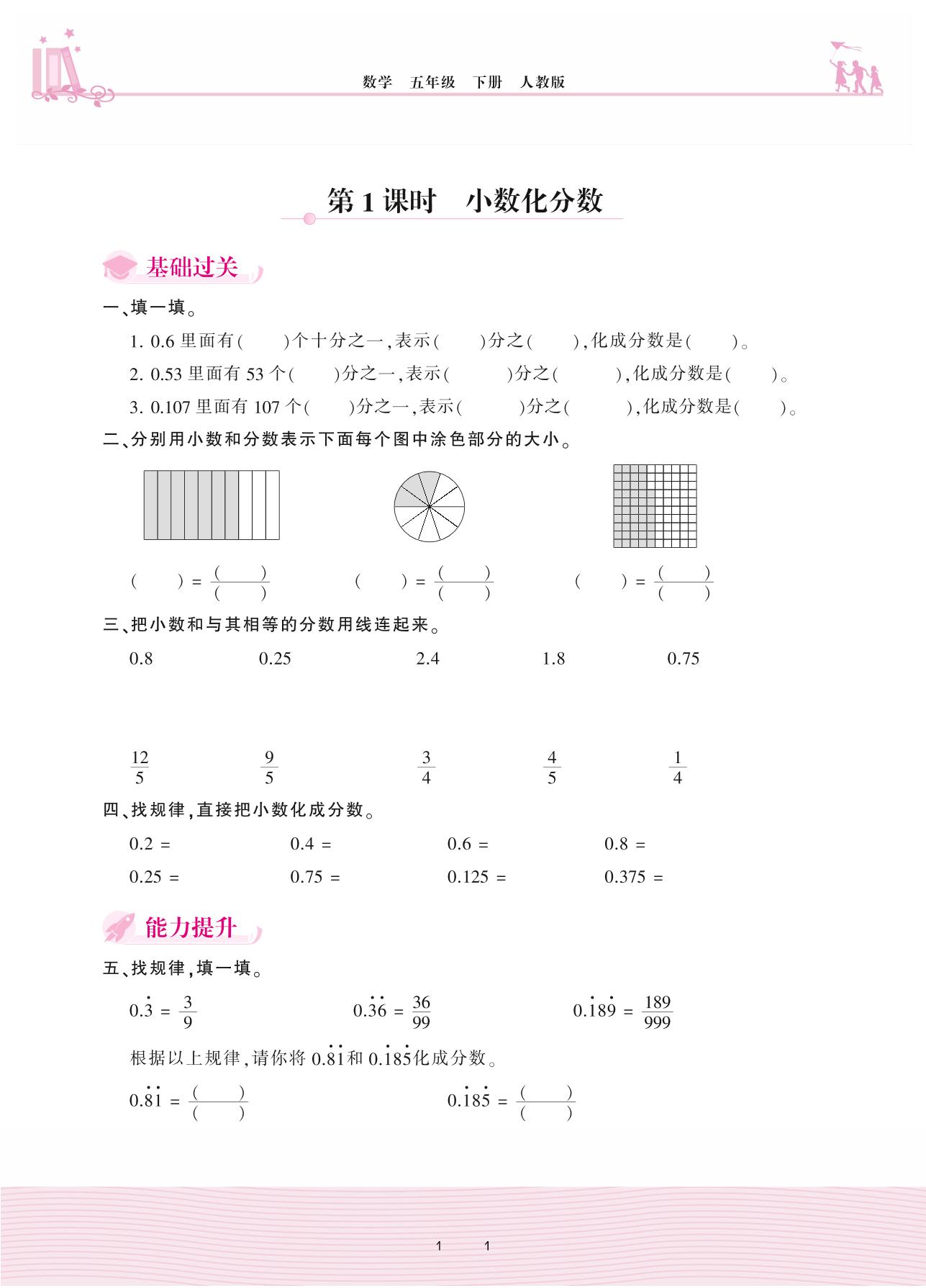 2021下册五年级数学人教版 4 分数的意义和性质 6. 分数和小数的互化——第1课时 小数化分数