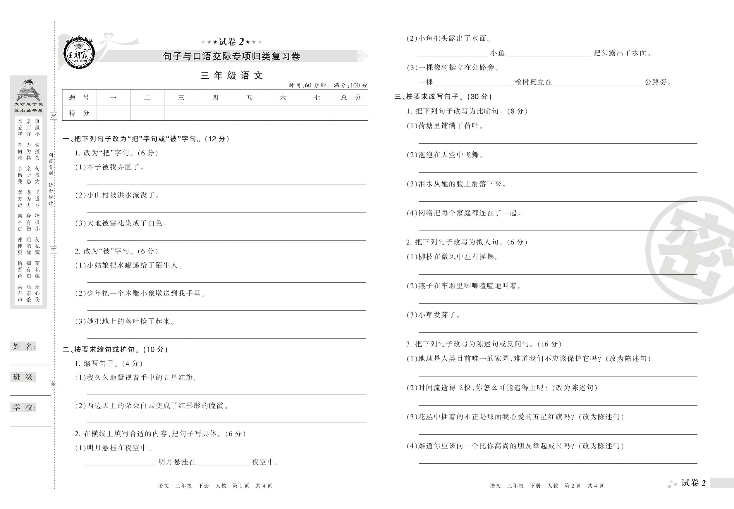 王朝霞期末专项卷——句子与口语交际专项归类复习卷三年级下册语文(人教版)_R210801104631【2】