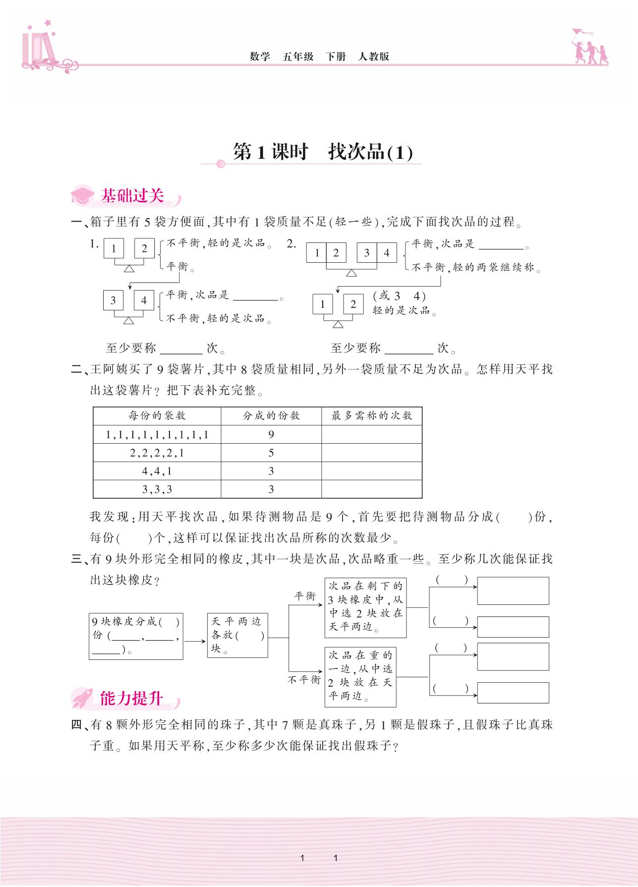 2021下册五年级数学人教版 8 数学广角 找次品——第1课时 找次品(1)