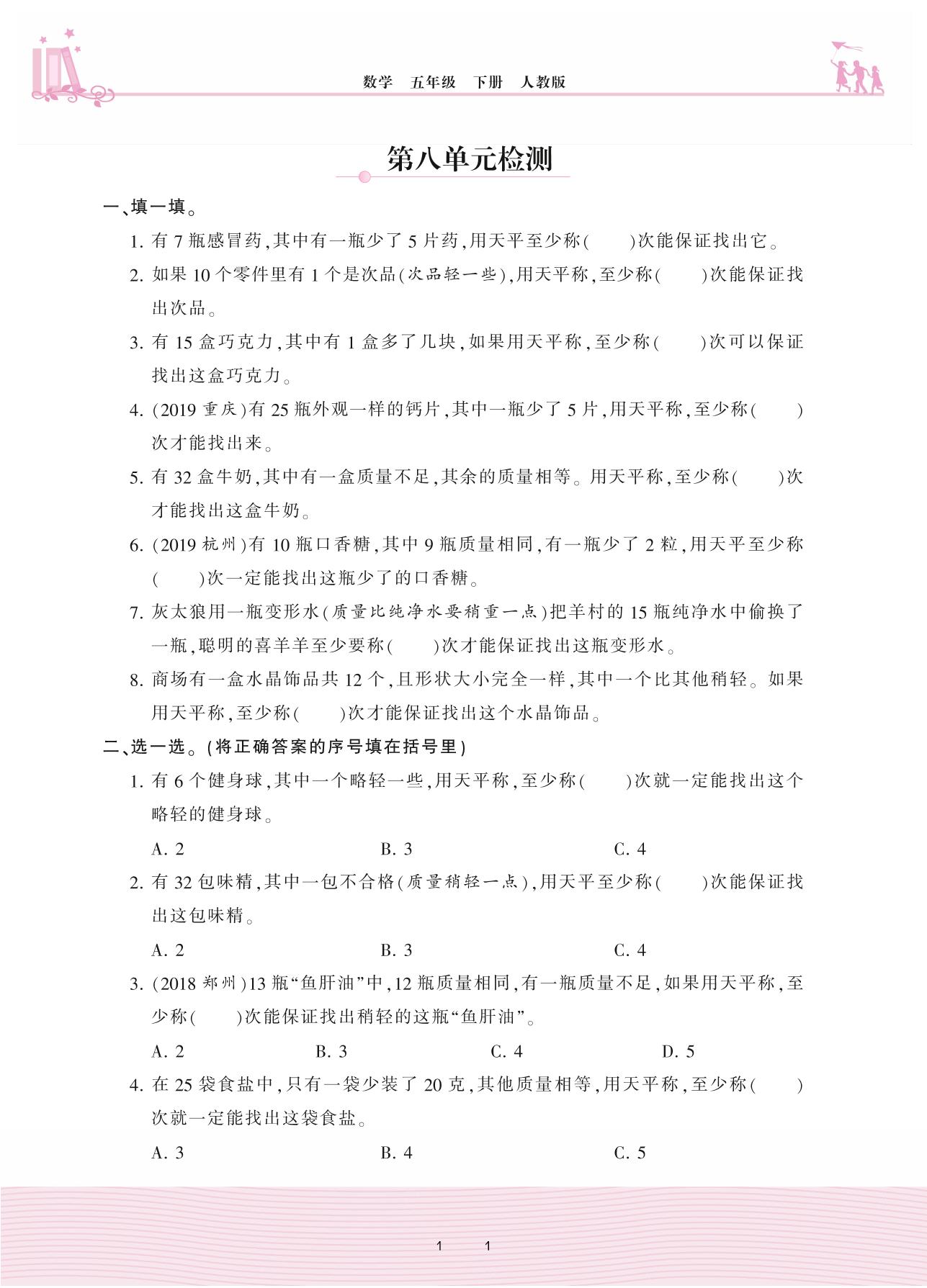 2021下册五年级数学人教版 8 数学广角 找次品——第八单元检测