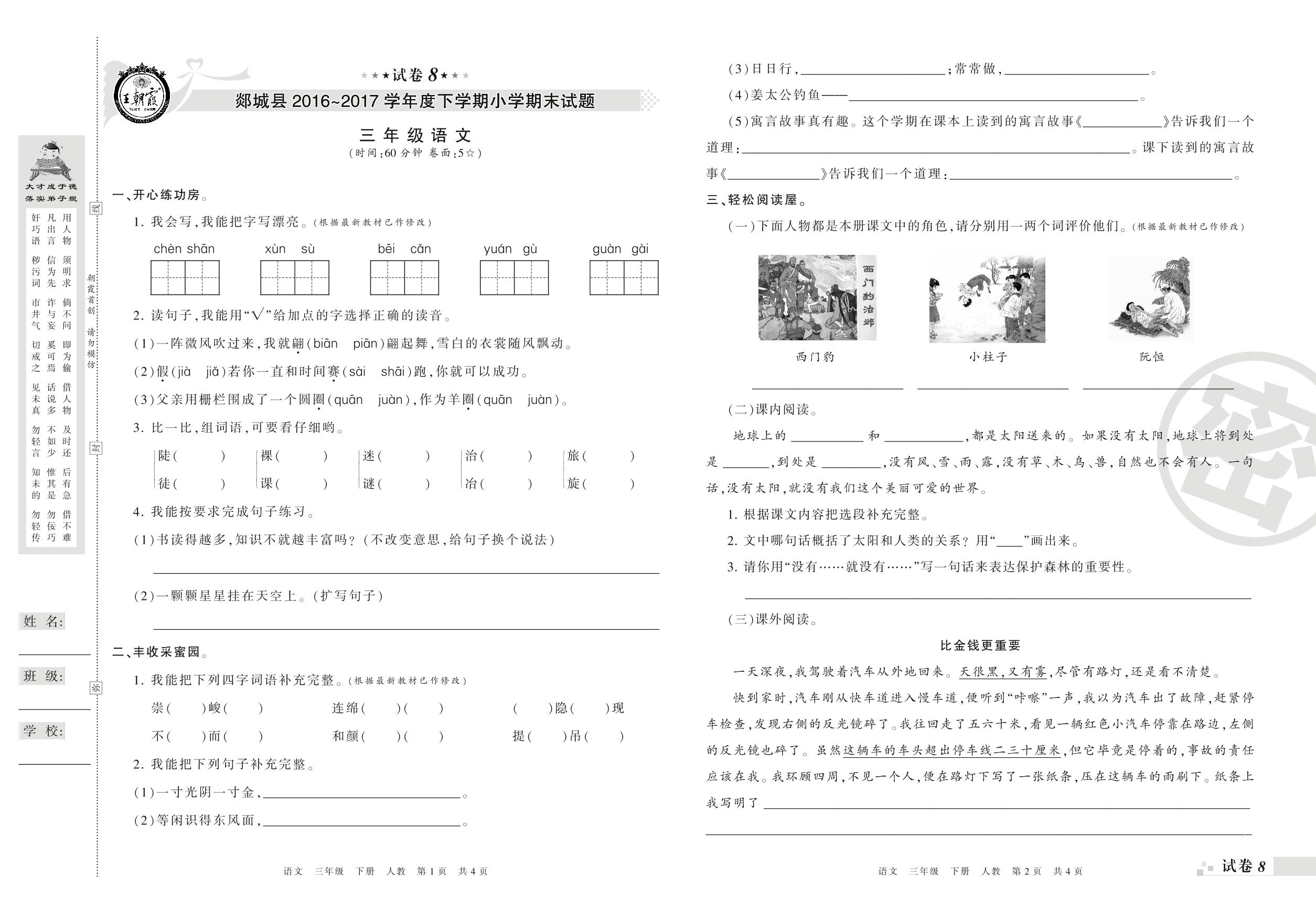 2016-2017学年第二学期临沂市郯城县三年级语文试卷(人教版)【8】