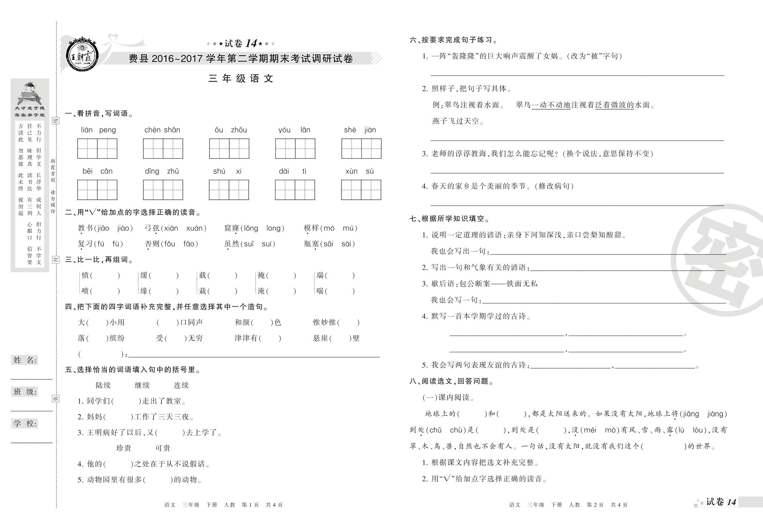 2016-2017学年第二学期临沂市费县三年级语文试卷(人教版)【14】