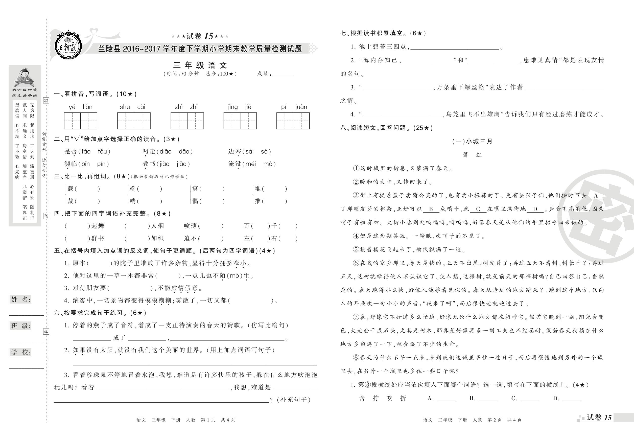 2016-2017学年第二学期临沂市兰陵县三年级语文试卷(人教版)【15】