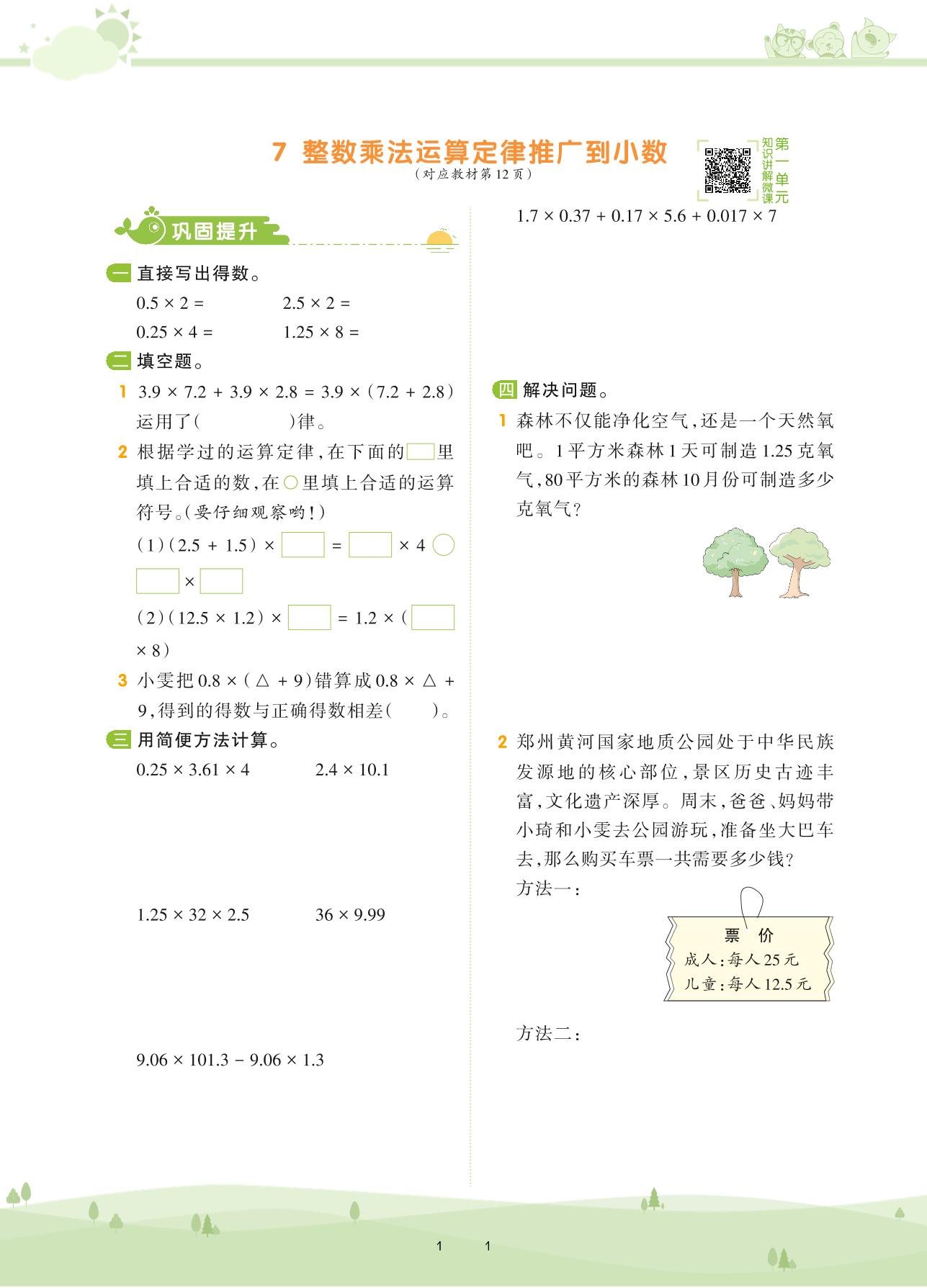 2020上册五年级数学人教版 第一单元 小数乘法——7 整数乘法运算定律推广到小数