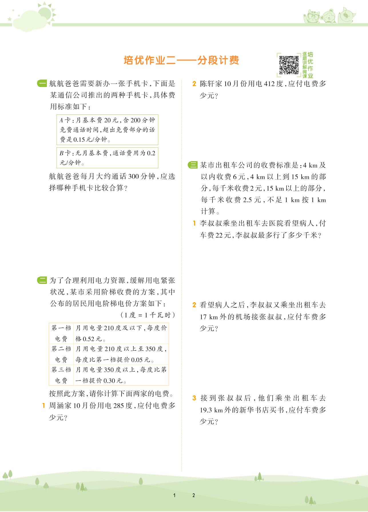 2020上册五年级数学人教版 第一单元 小数乘法——培优作业二 分段计费