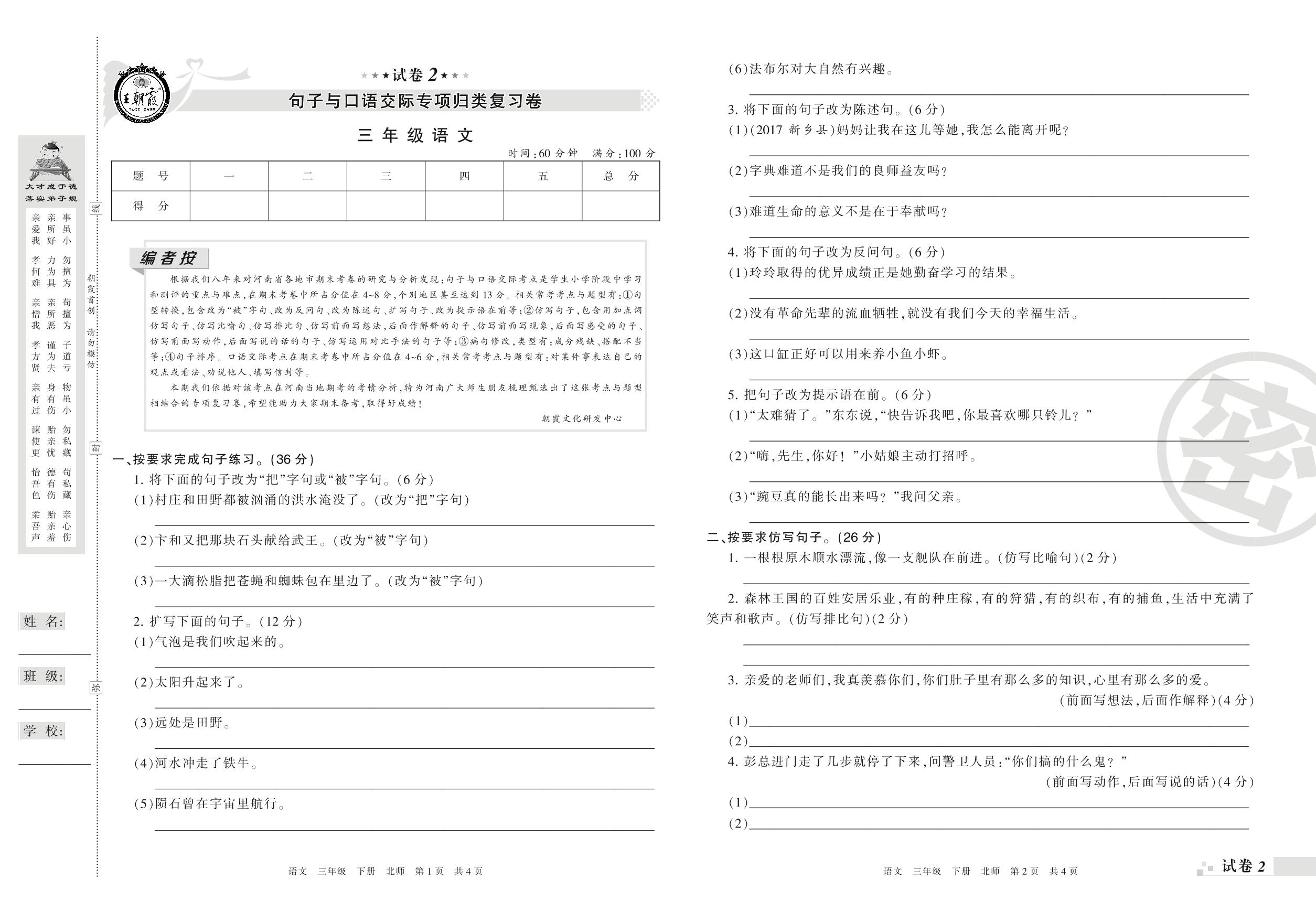 王朝霞期末专项卷——句子与口语交际专项归类复习卷三年级下册语文(北师版)_R210801104714【2】