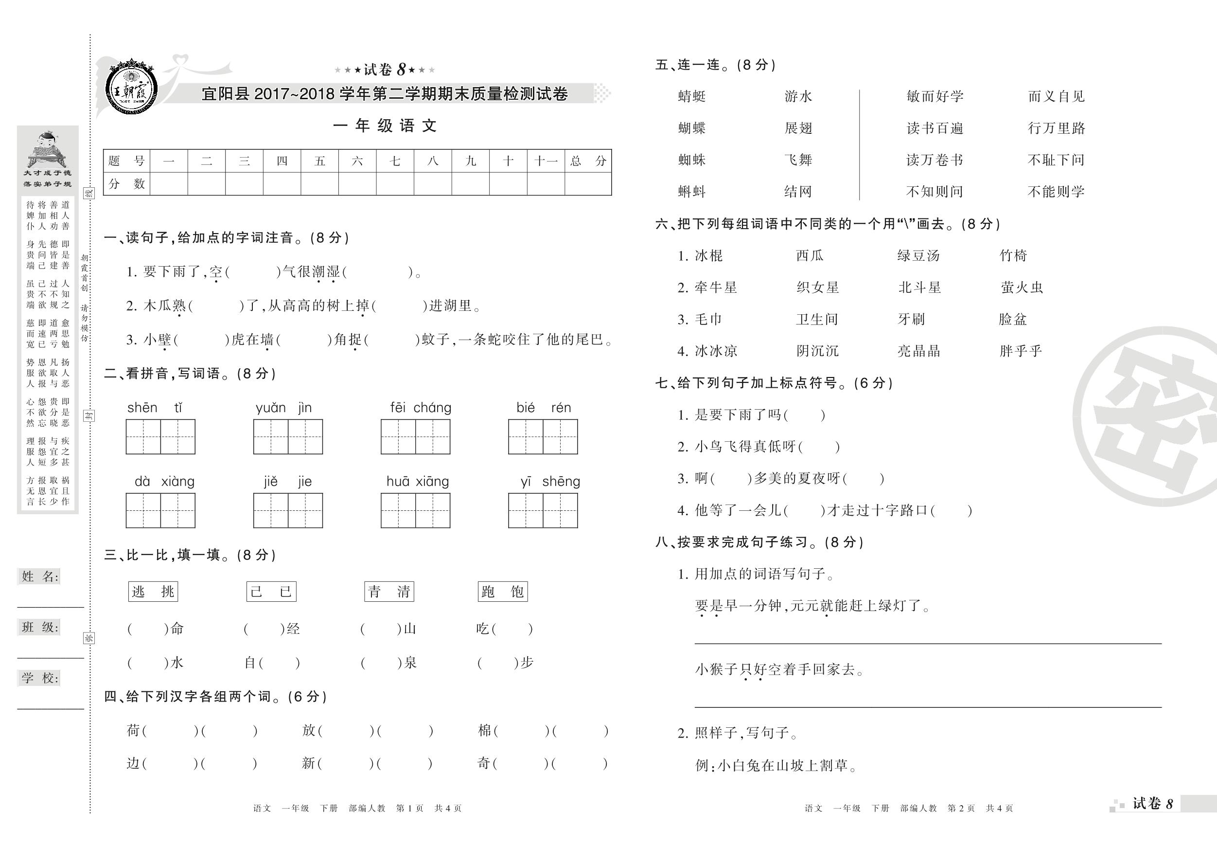 2017-2018学年第二学期洛阳市宜阳县一年级语文试卷(人教版)【8】