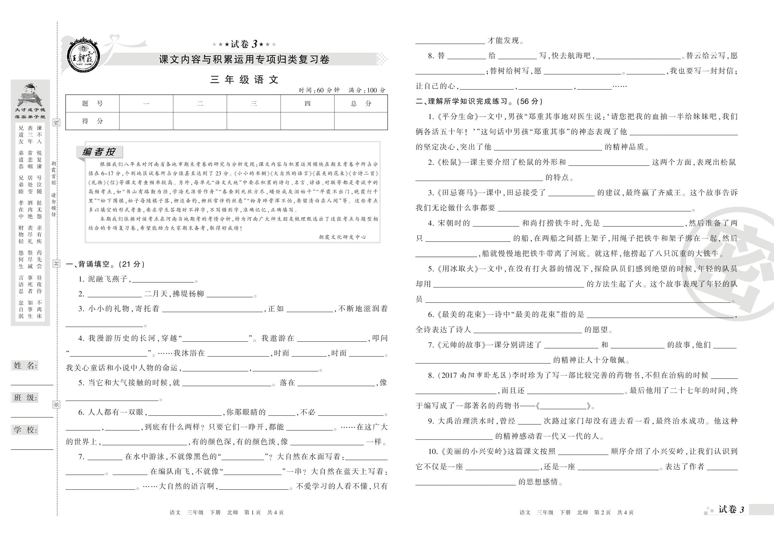 王朝霞期末专项卷——课文内容与积累运用专项归类复习卷三年级下册语文(北师版)_R210801104717【3】
