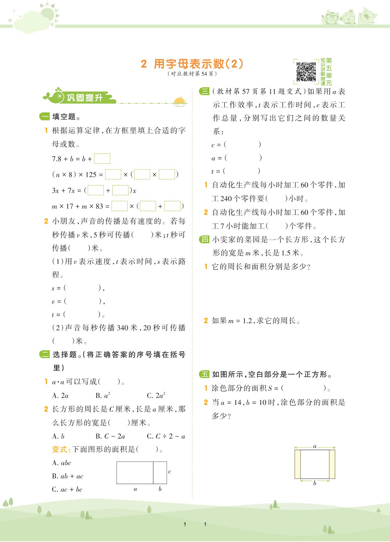 2020上册五年级数学人教版 第五单元 简易方程——2 用字母表示数(2)