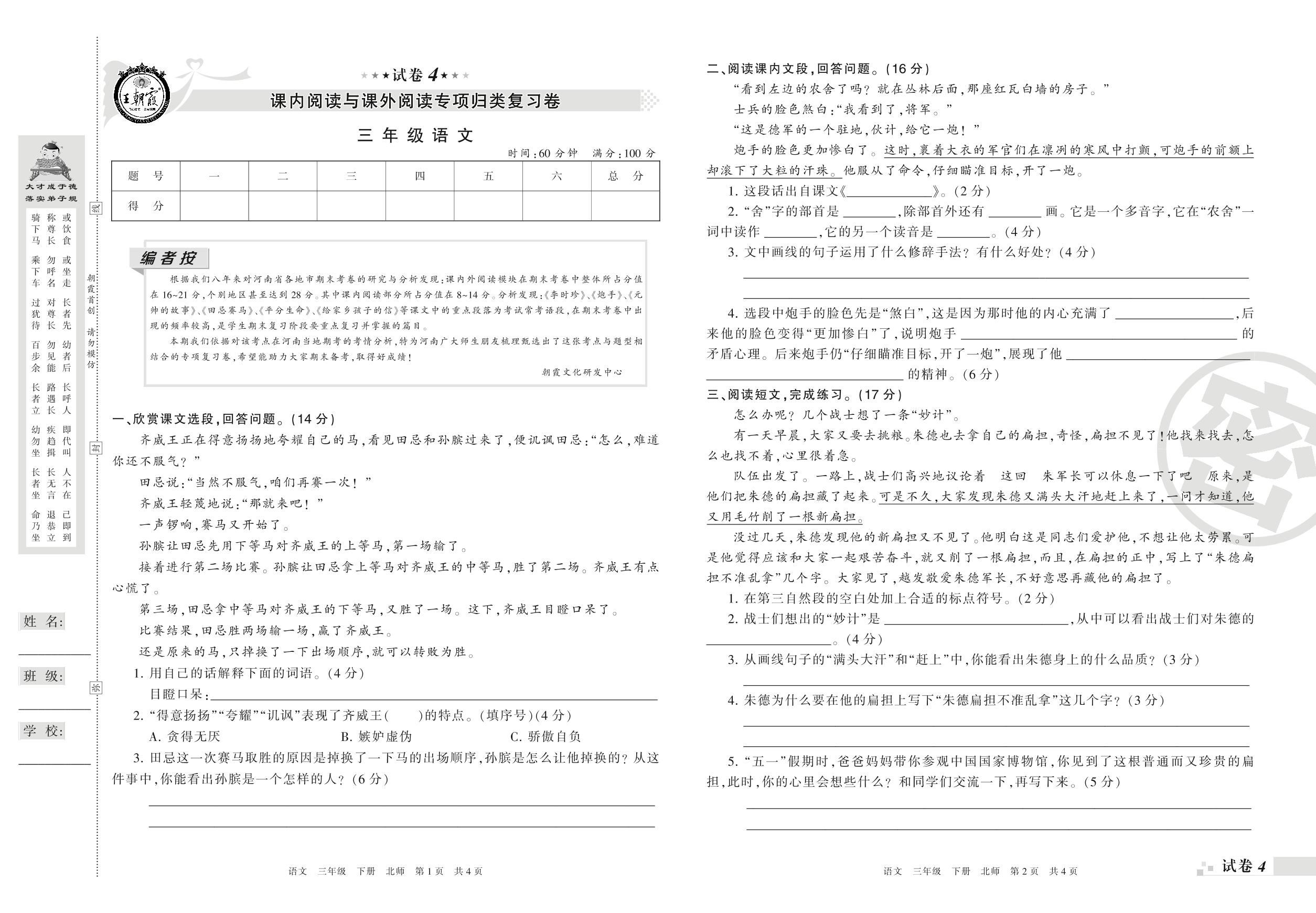 王朝霞期末专项卷——课内阅读与课外阅读专项归类复习卷三年级下册语文(北师版)_R210801104719【4】