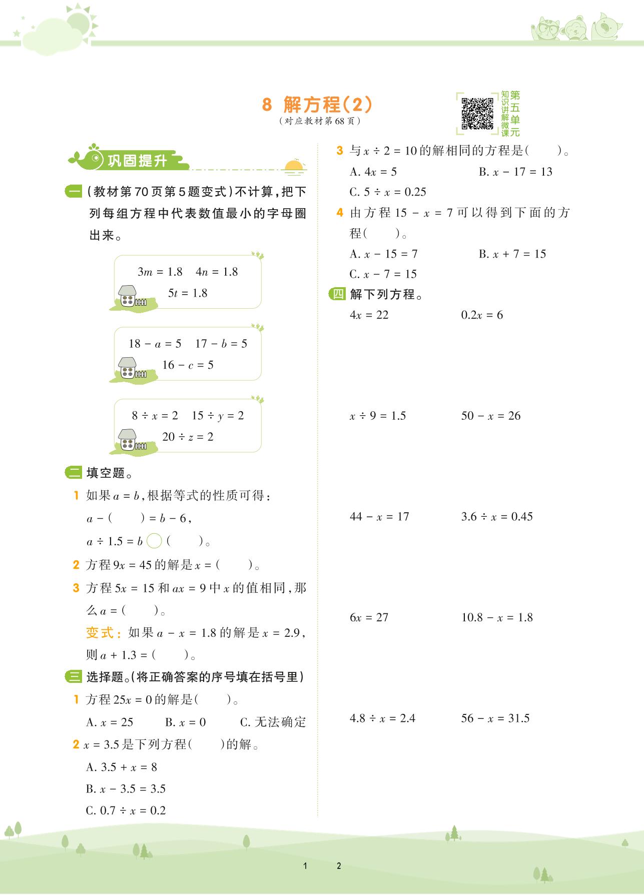 2020上册五年级数学人教版 第五单元 简易方程——8 解方程(2)