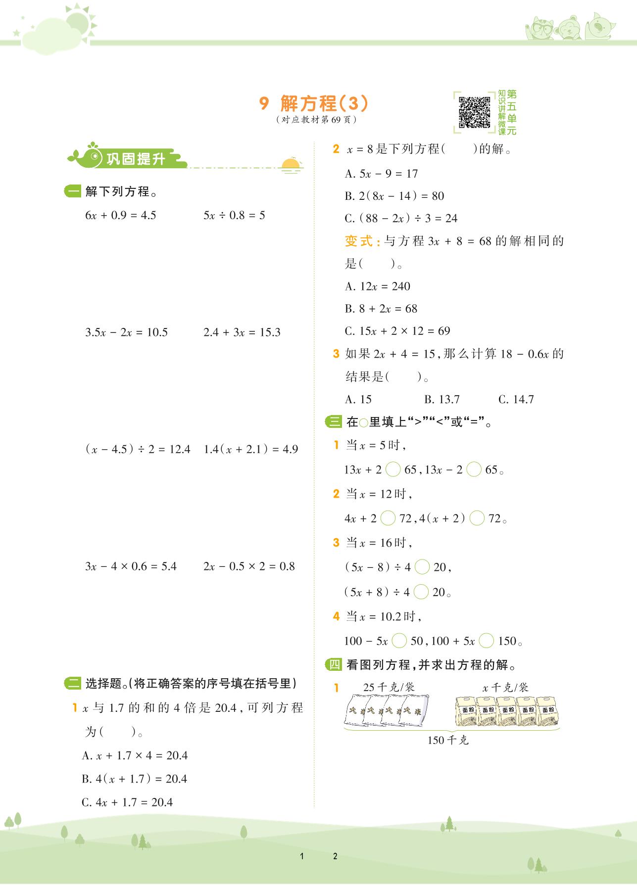 2020上册五年级数学人教版 第五单元 简易方程——9 解方程(3)
