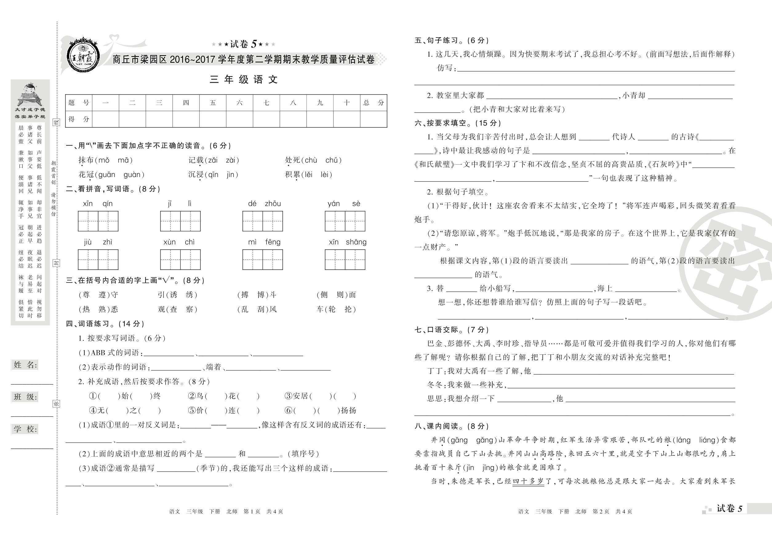 2016-2017学年第二学期商丘市梁园区三年级语文试卷(北师版)【5】