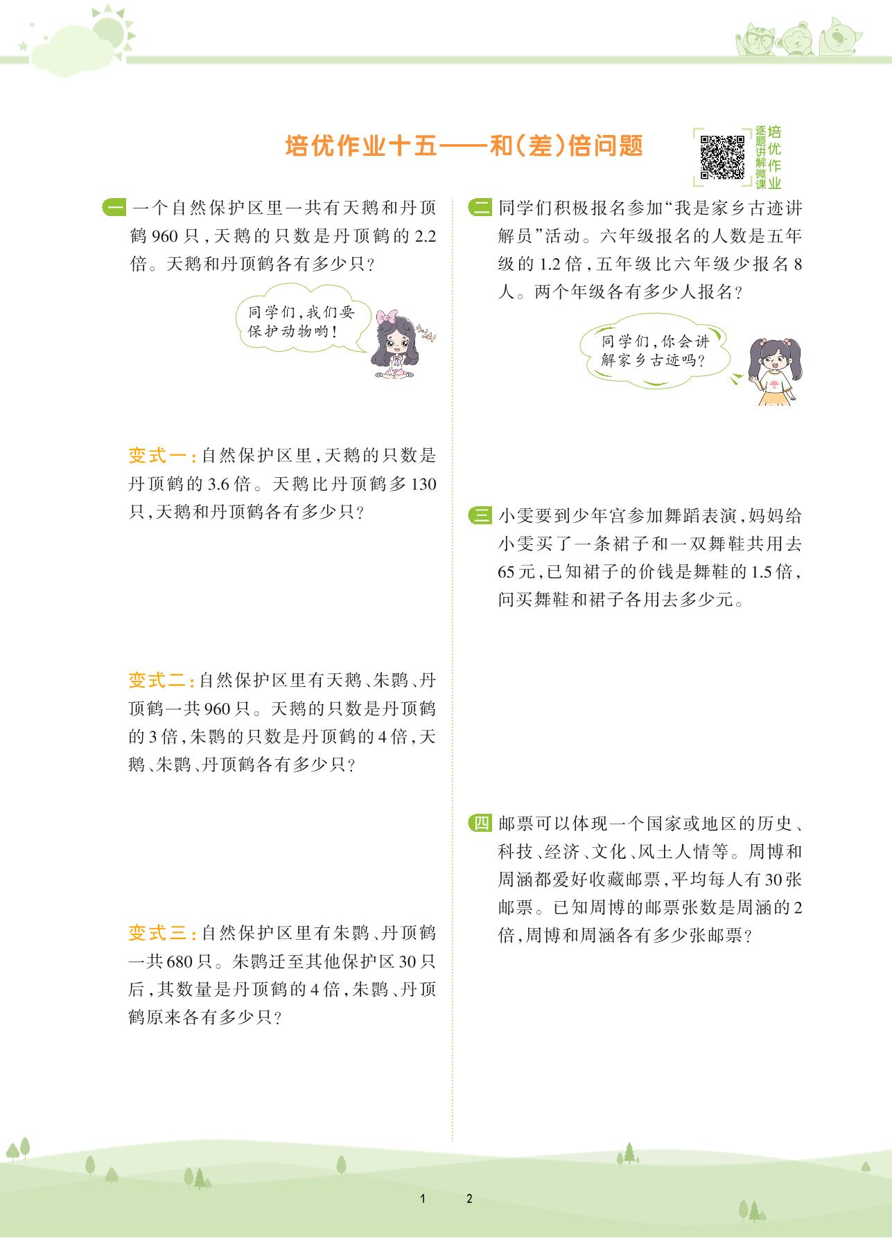 2020上册五年级数学人教版 第五单元 简易方程——培优作业十五 和(差)倍问题