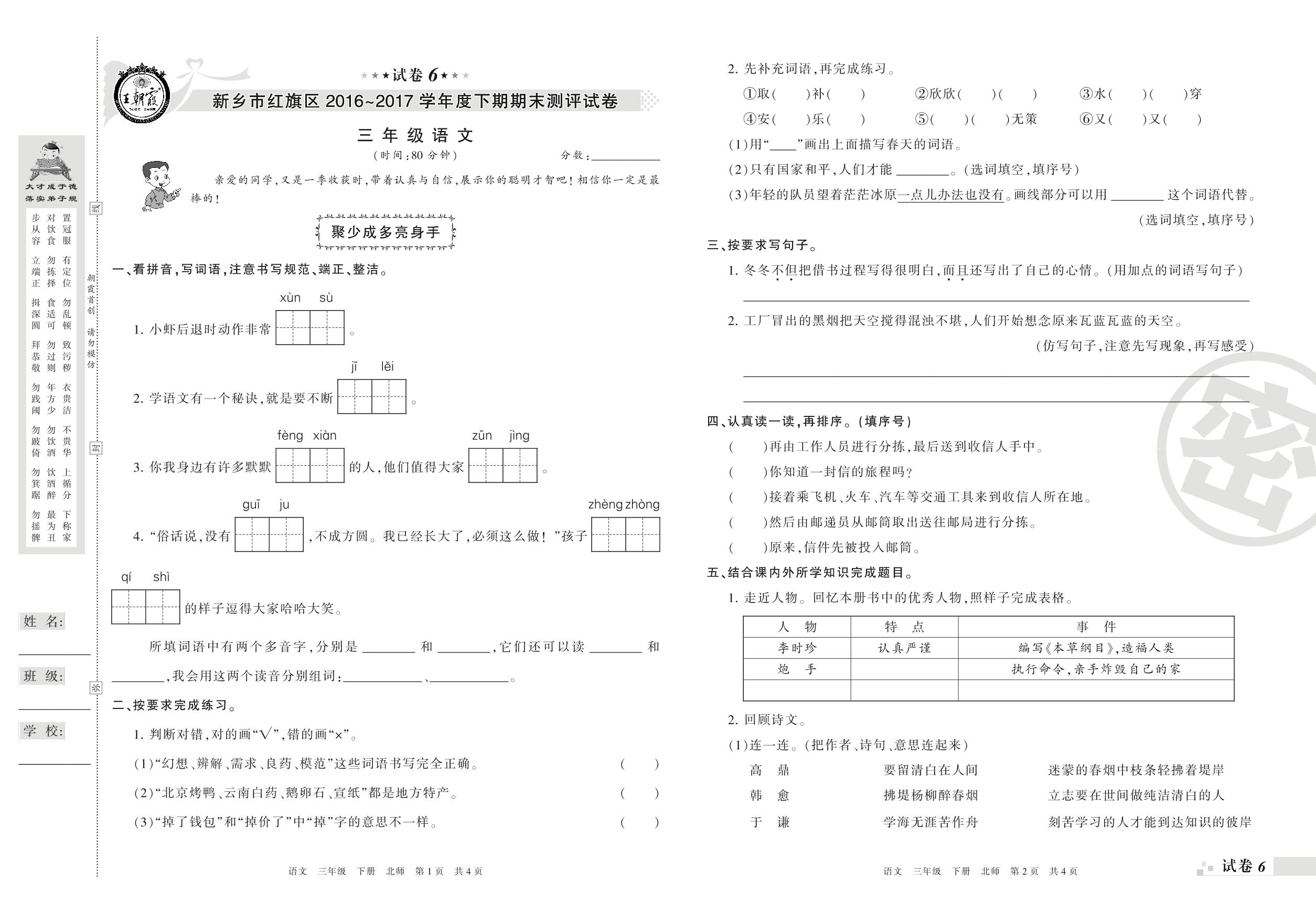 2016-2017学年第二学期新乡市红旗区三年级语文试卷(北师版)【6】