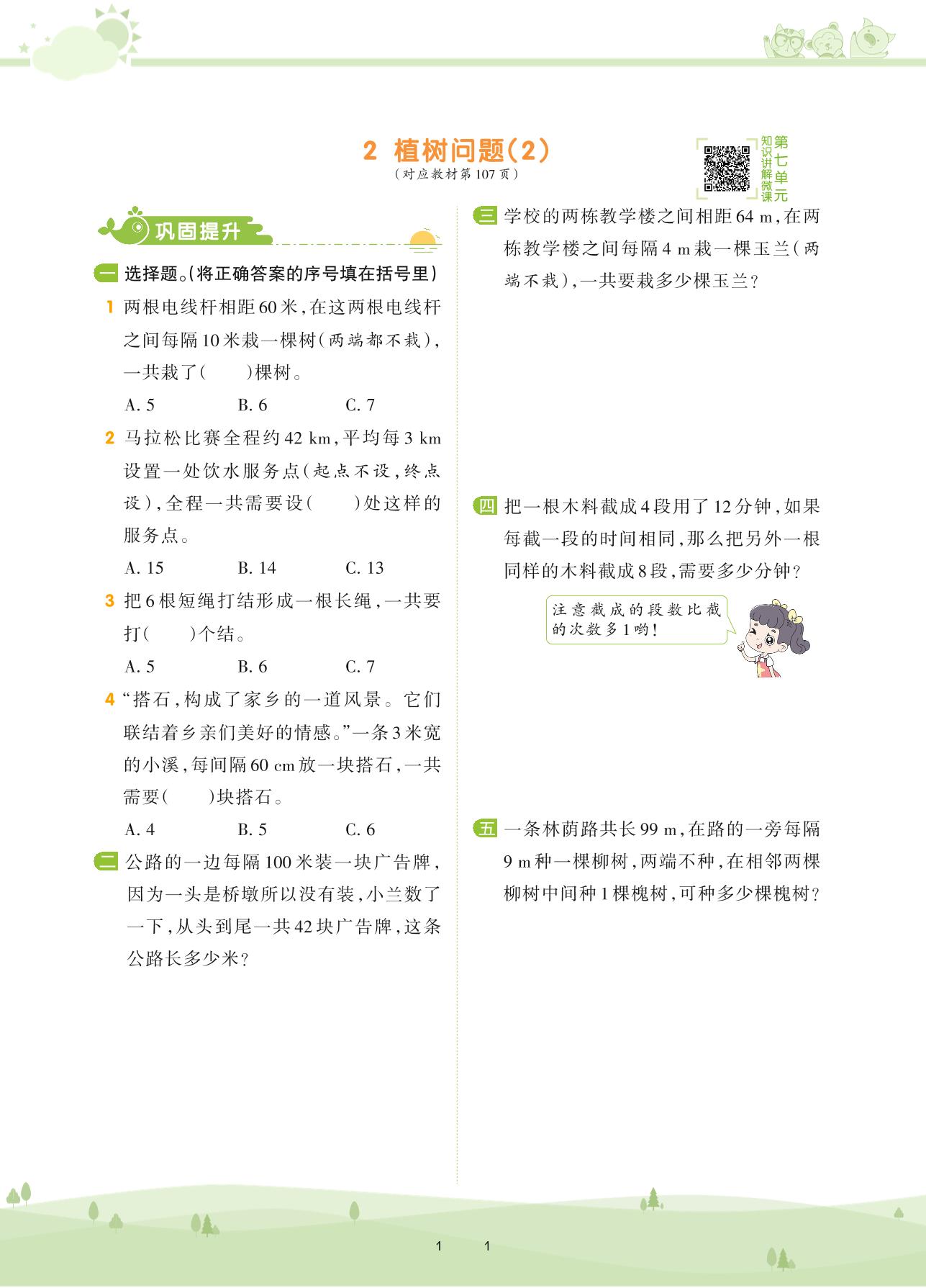 2020上册五年级数学人教版 第七单元 数学广角——植树问题——2 植树问题(2)
