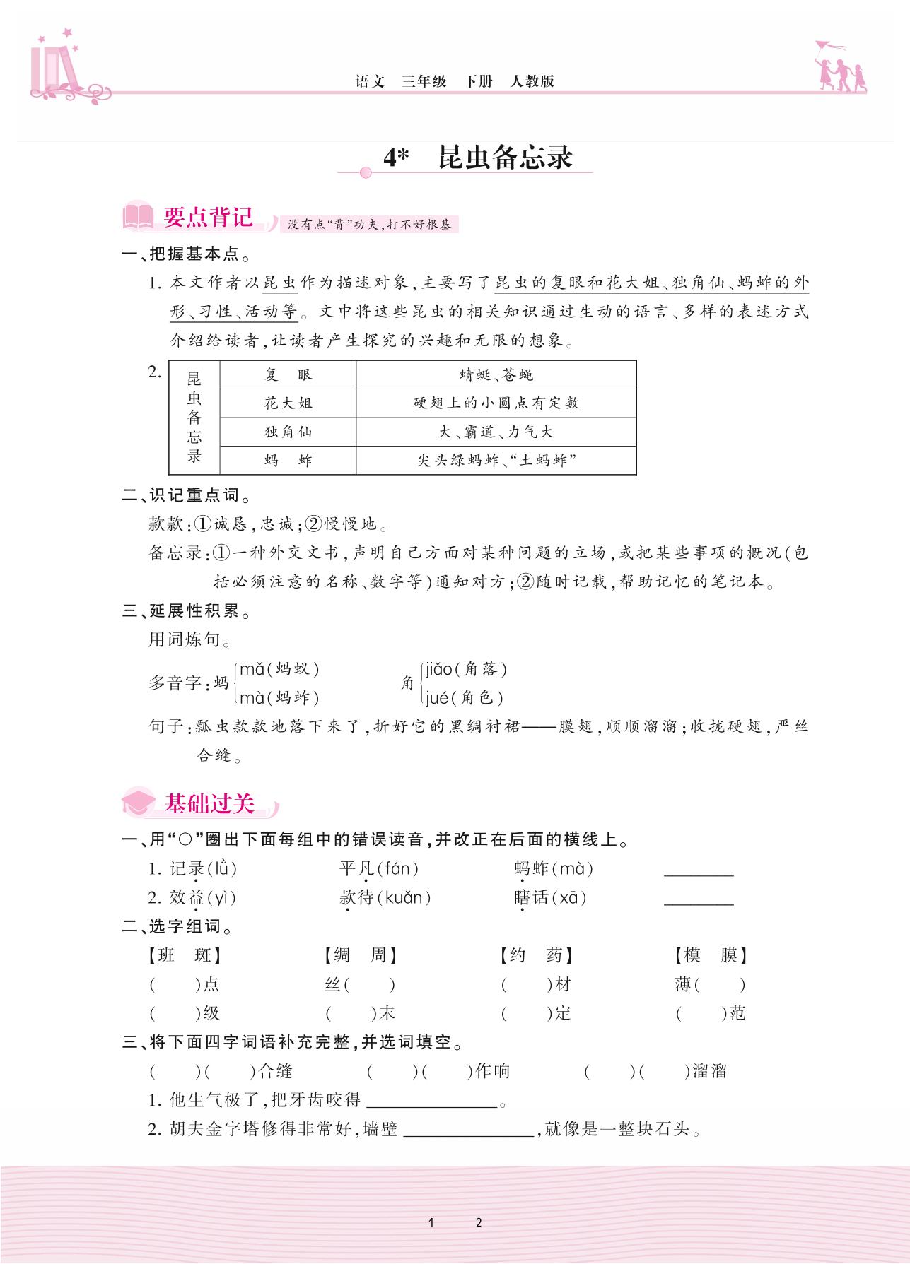 2021下册三年级语文人教版 第一单元——4 昆虫备忘录