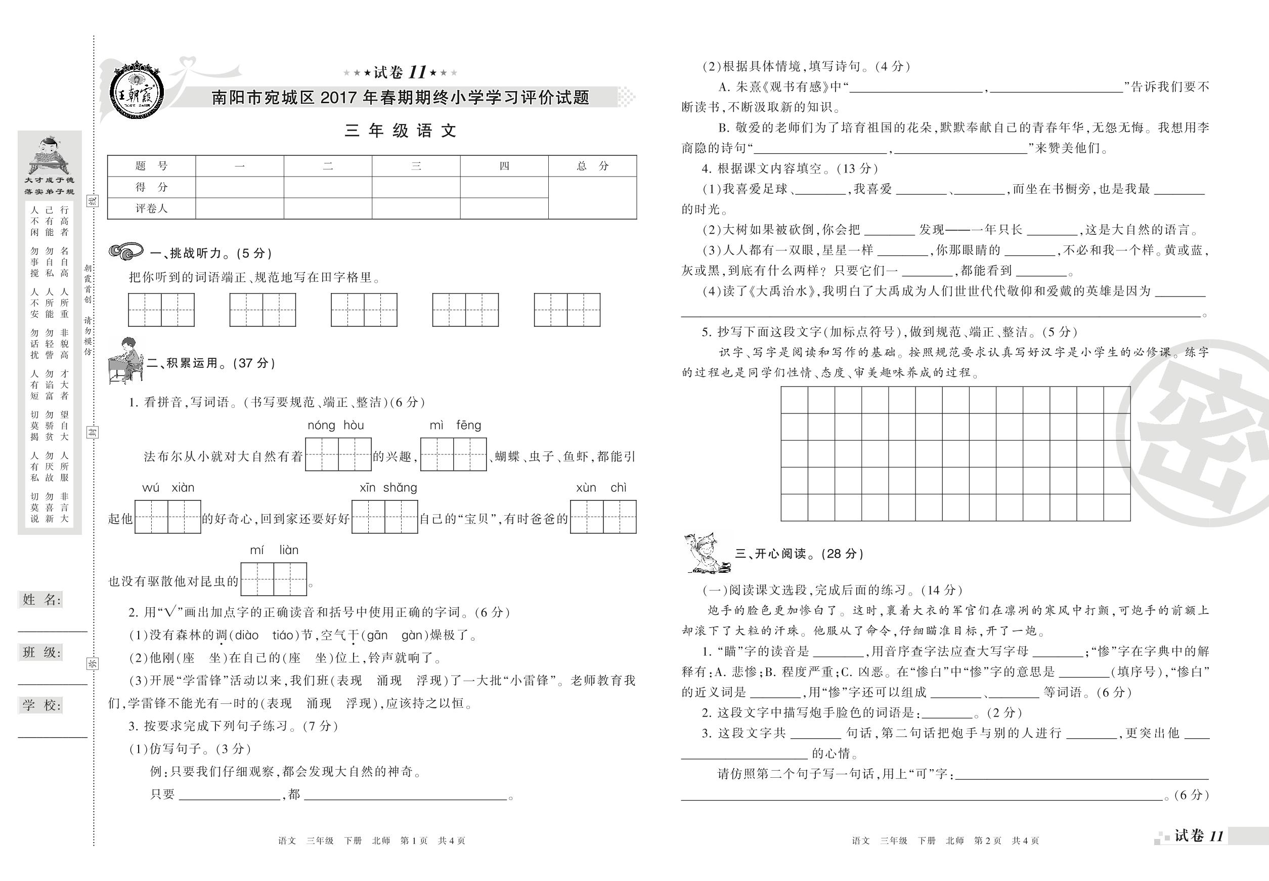 2016-2017学年第二学期南阳市宛城区三年级语文试卷(北师版)【11】
