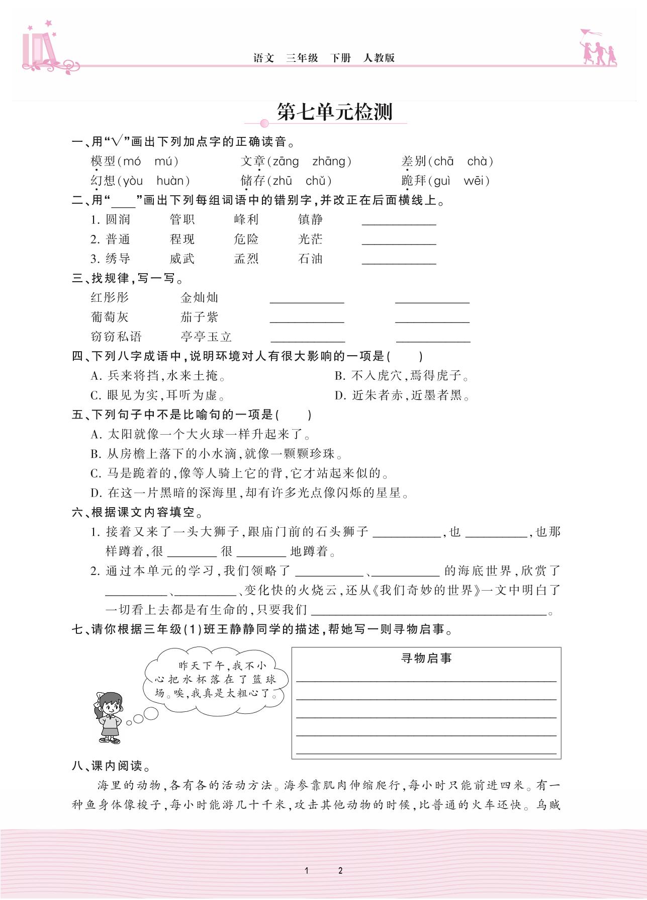 2021下册三年级语文人教版 第七单元——第七单元检测