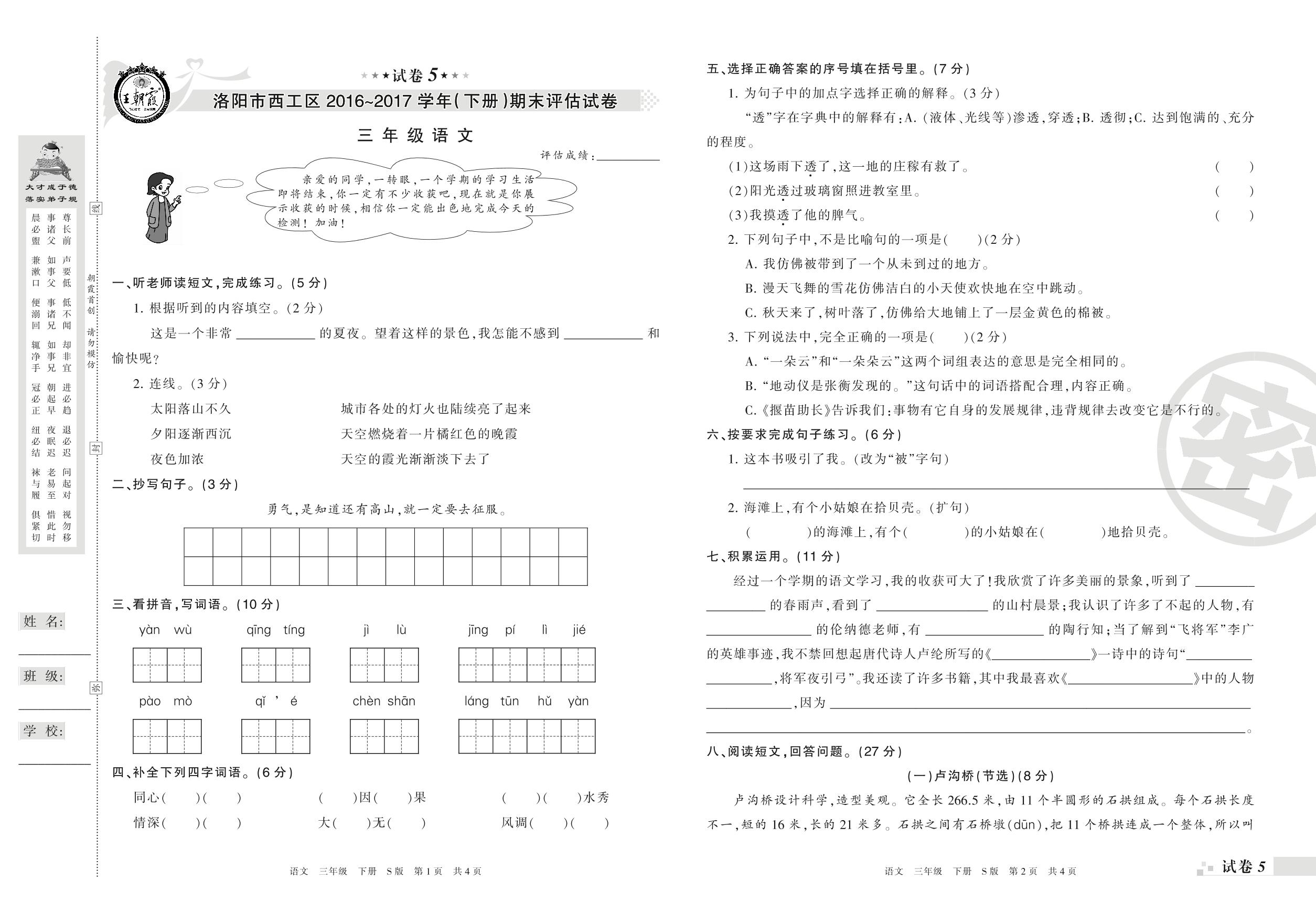 2016-2017学年第二学期洛阳市西工区三年级语文试卷(S版)【5】