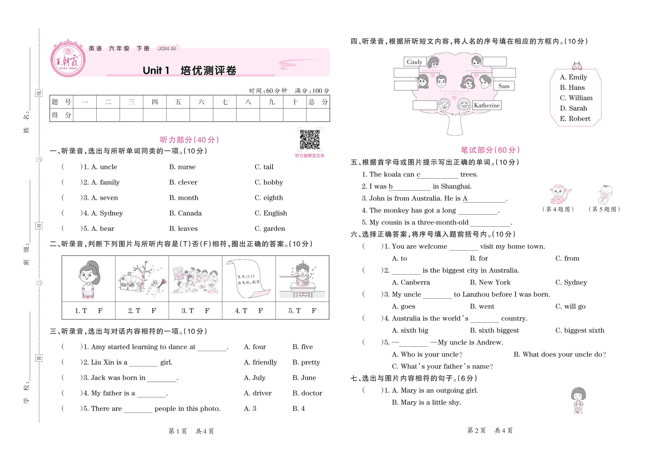 2021下册六年级英语剑桥版 Unit 1 培优测评卷