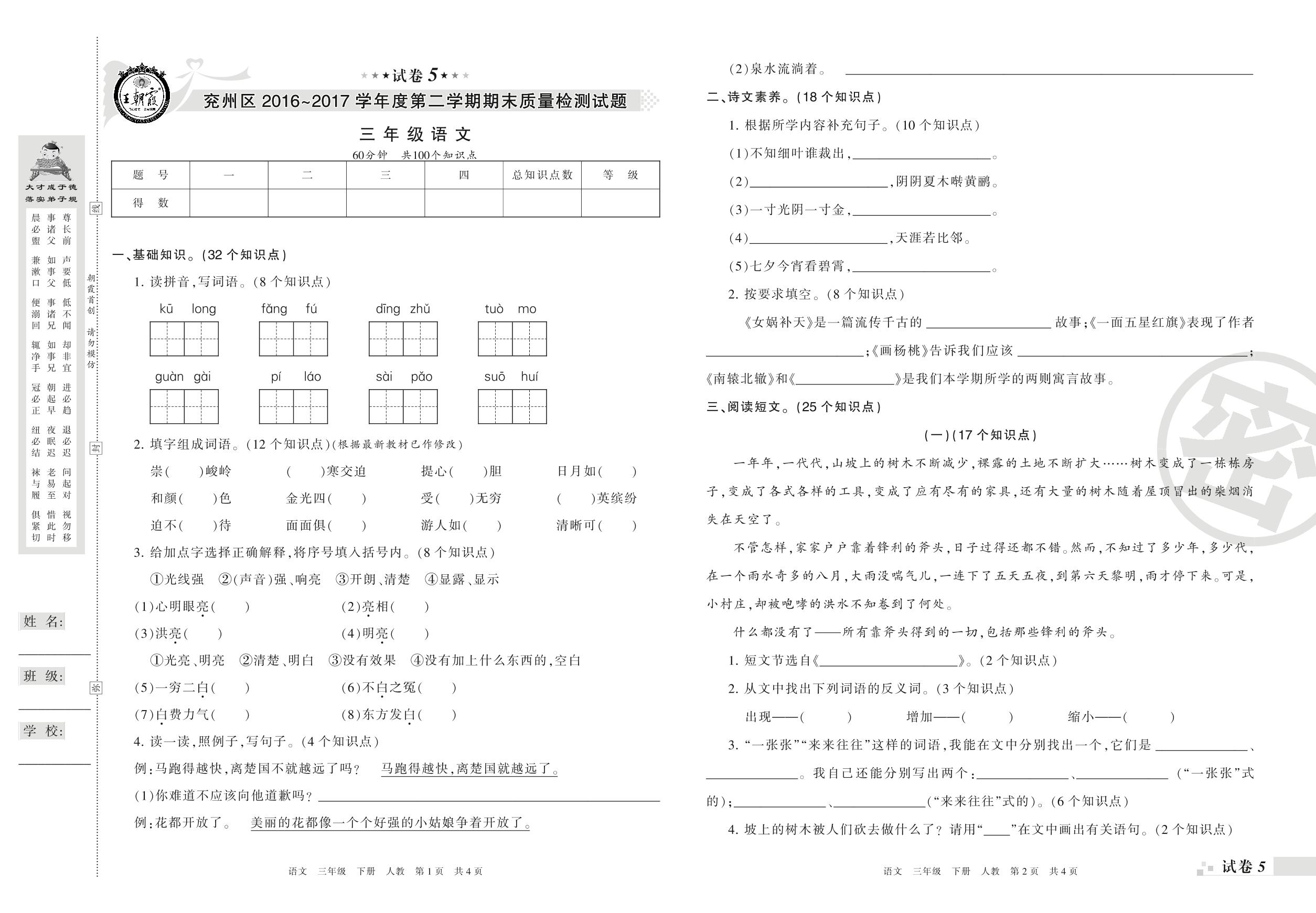 2016-2017学年第二学期济宁市兖州区三年级语文试卷(人教版)【5】