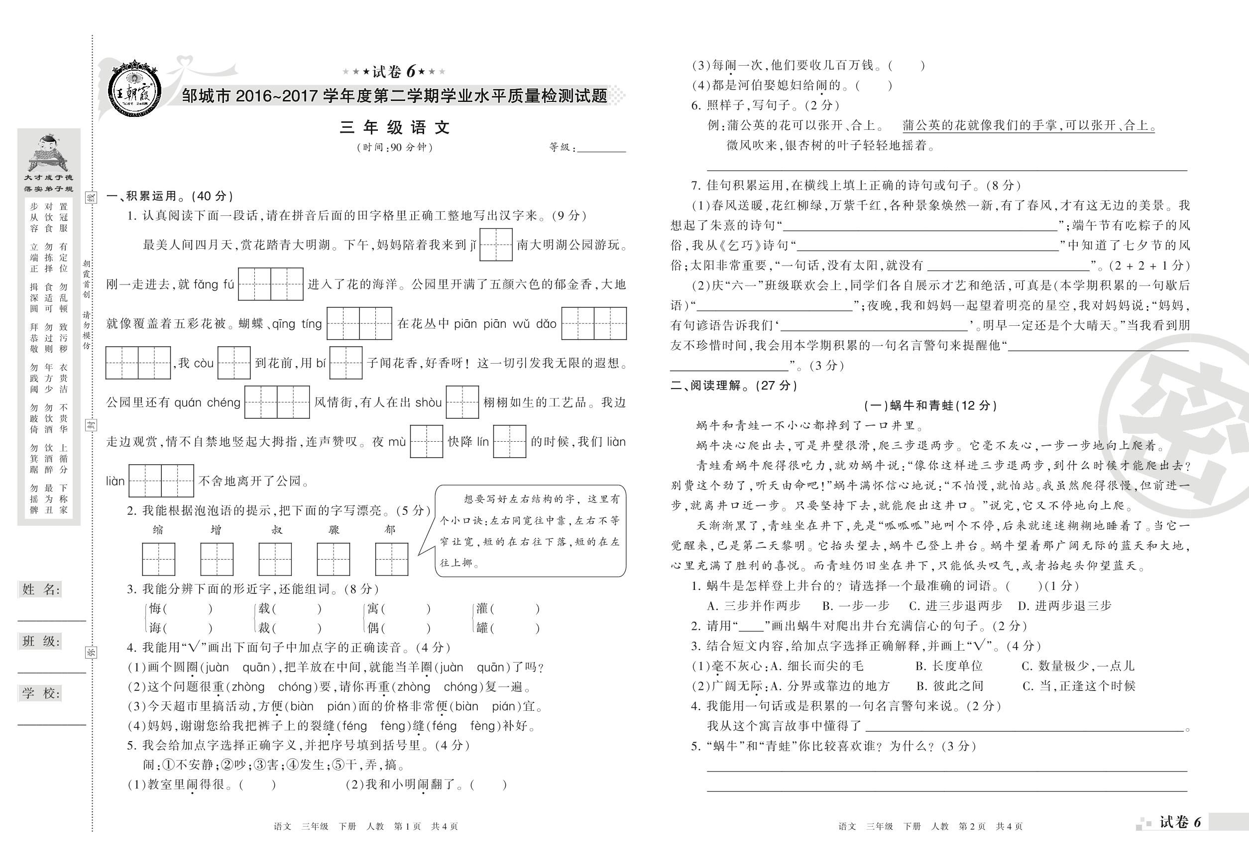 2016-2017学年第二学期邹城市三年级语文试卷(人教版)【6】