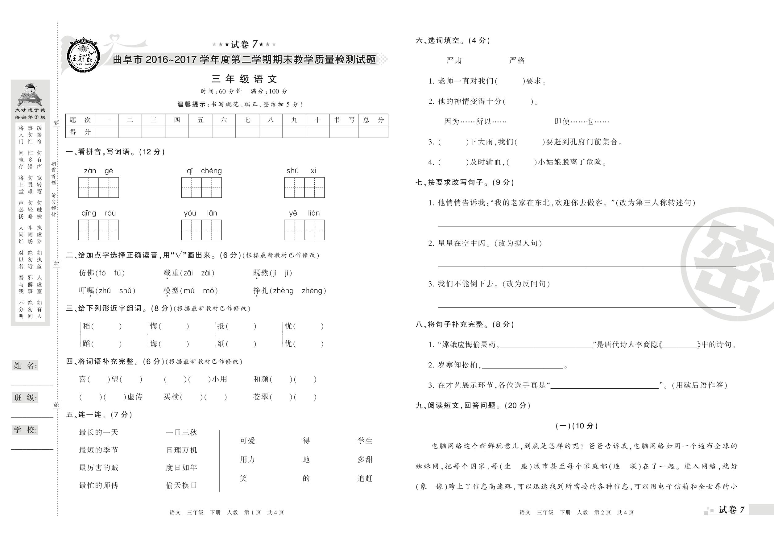 2016-2017学年第二学期曲阜市三年级语文试卷(人教版)【7】