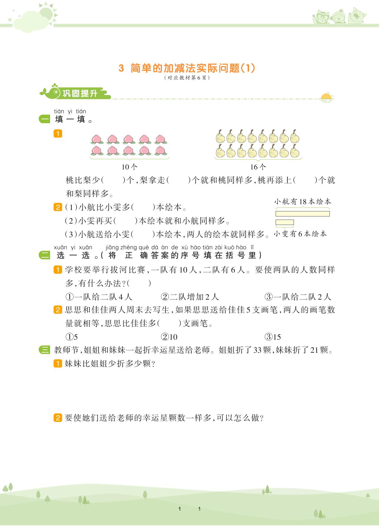2020上册二年级数学苏教版 第一单元 100以内的加法和减法(三)——3 简单的加减法实际问题(1)