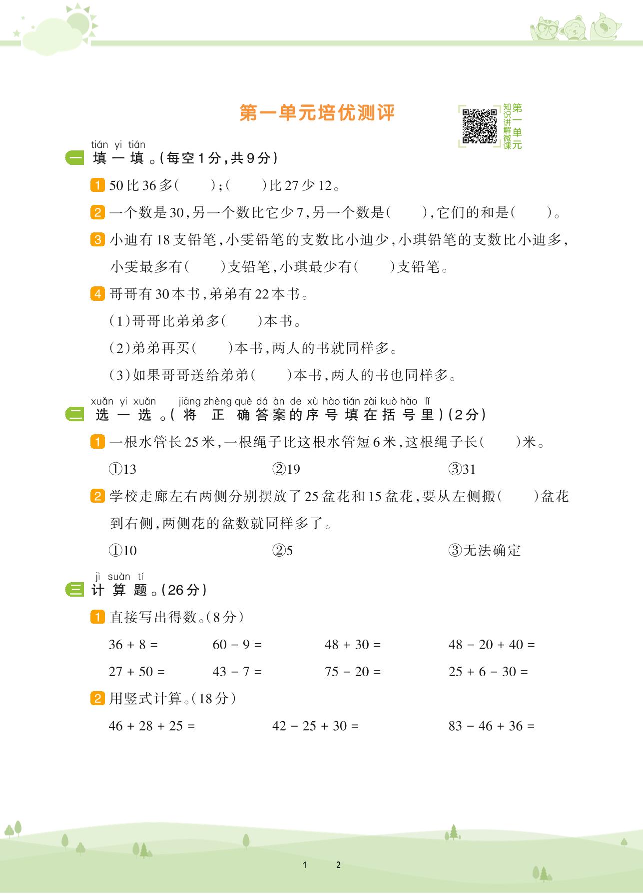2020上册二年级数学苏教版 第一单元培优测评
