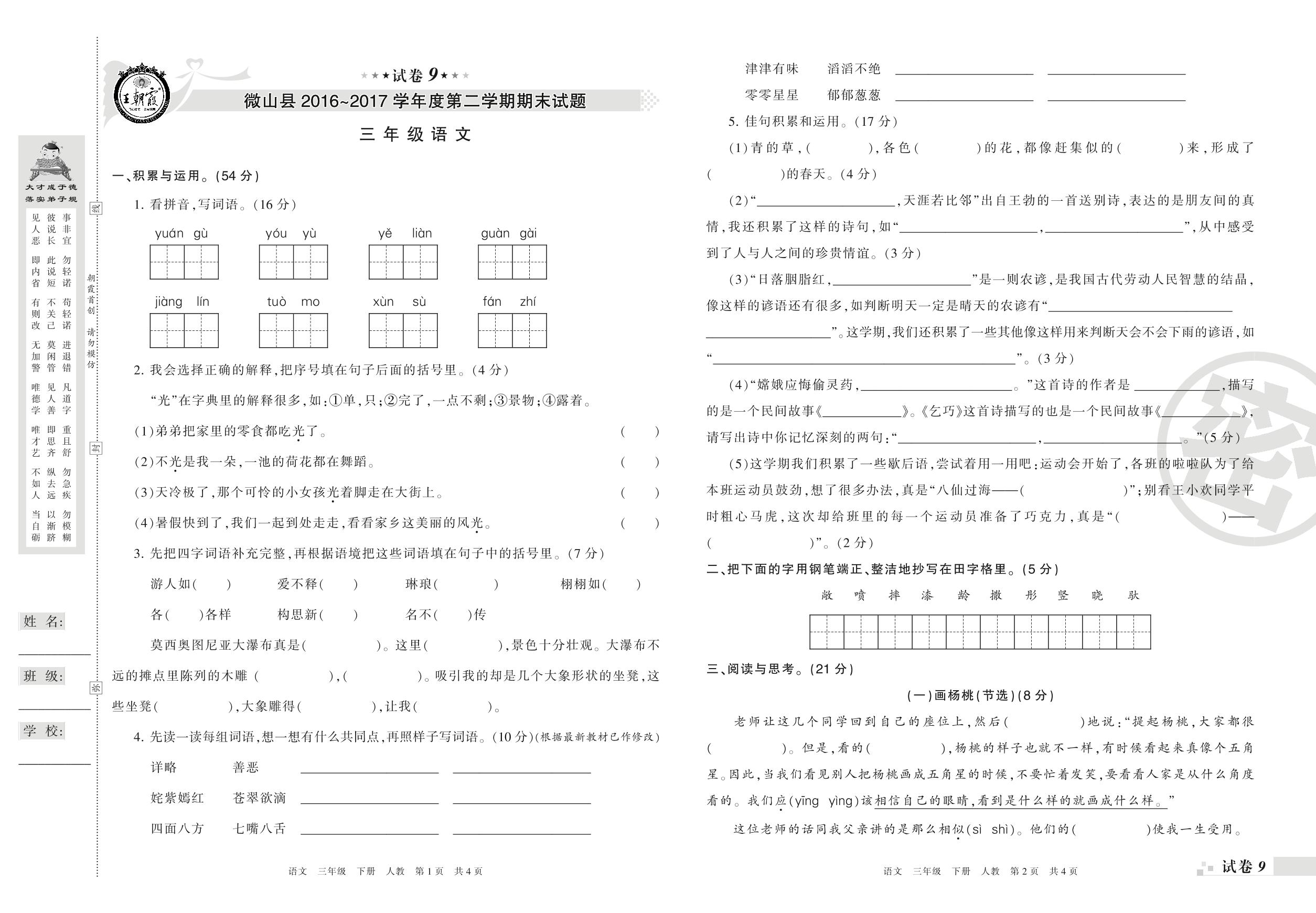 2016-2017学年第二学期济宁市微山县三年级语文试卷(人教版)【9】