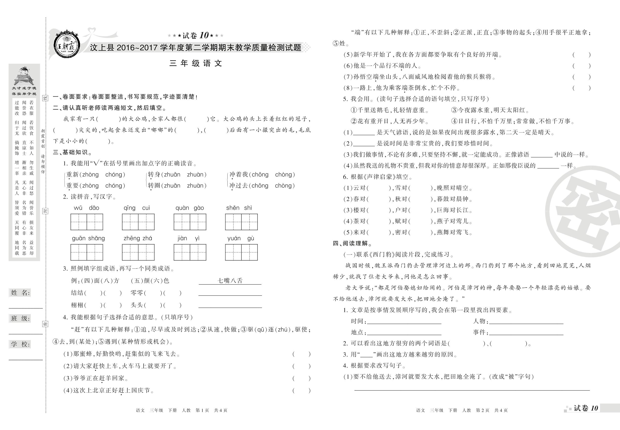 2016-2017学年第二学期济宁市汶上县三年级语文试卷(人教版)【10】
