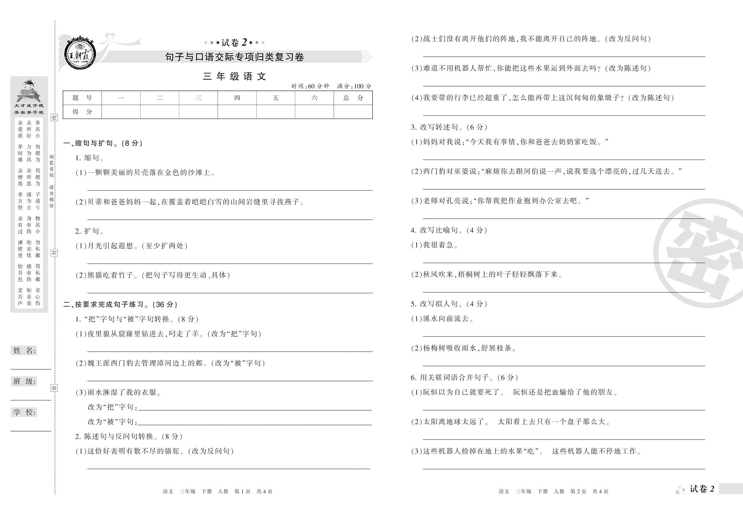 王朝霞期末专项卷——句子与口语交际专项归类复习卷三年级下册语文(人教版)_R210801104943【2】