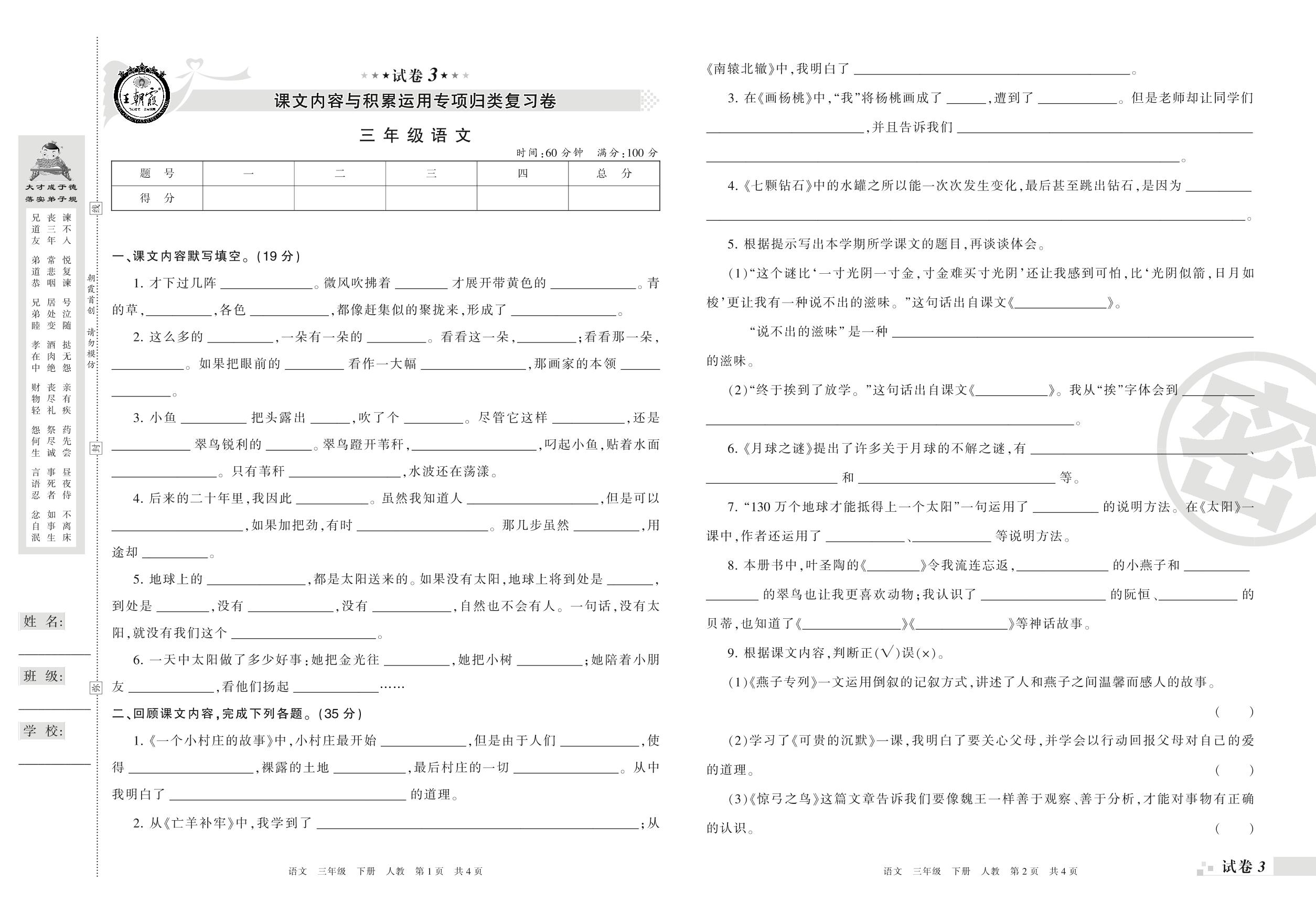 王朝霞期末专项卷——课文内容与积累运用专项归类复习卷三年级下册语文(人教版)_R210801104949【3】