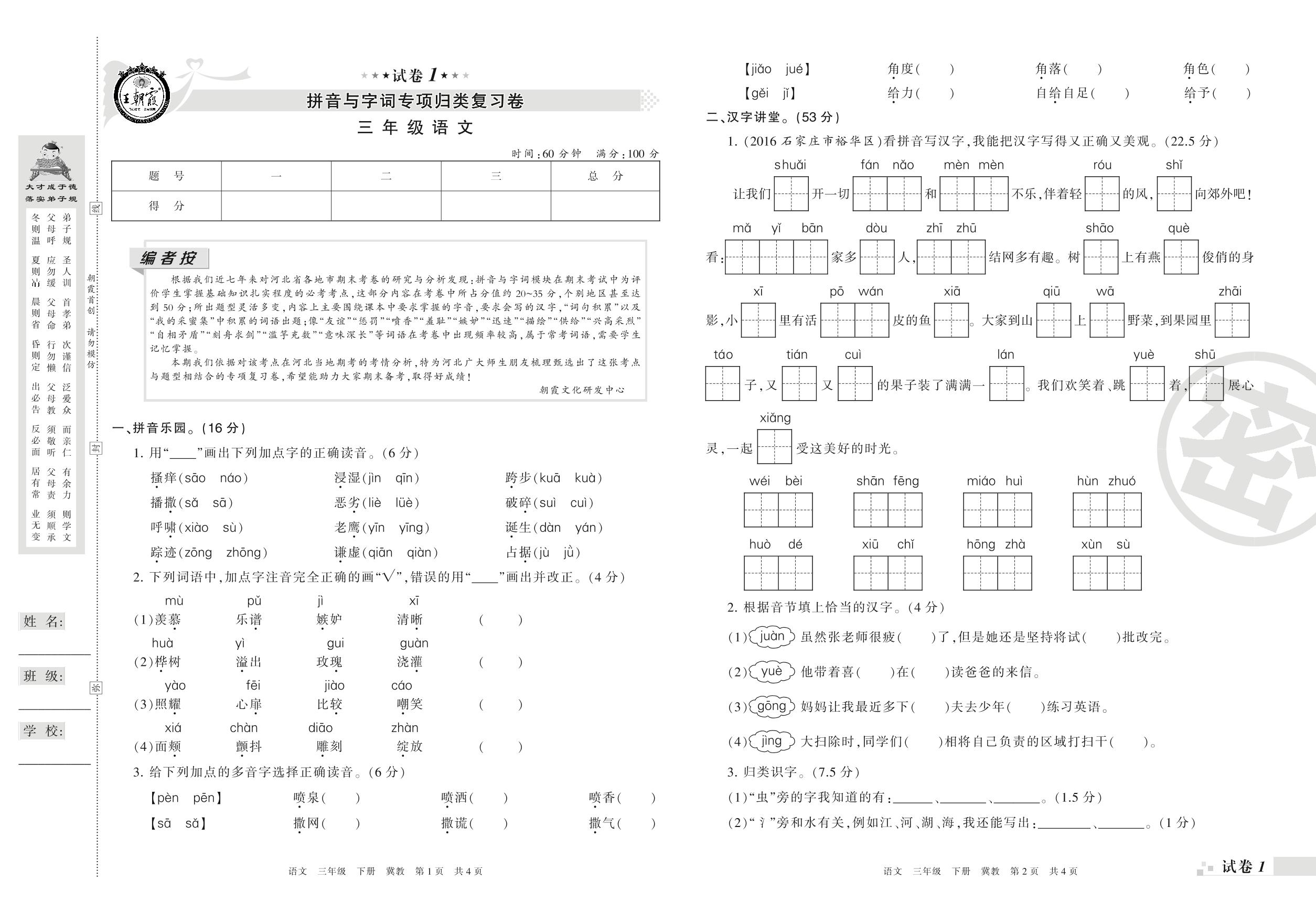 王朝霞期末专项卷——拼音与字词专项归类复习卷三年级下册语文(冀教版)_R210801104954【1】