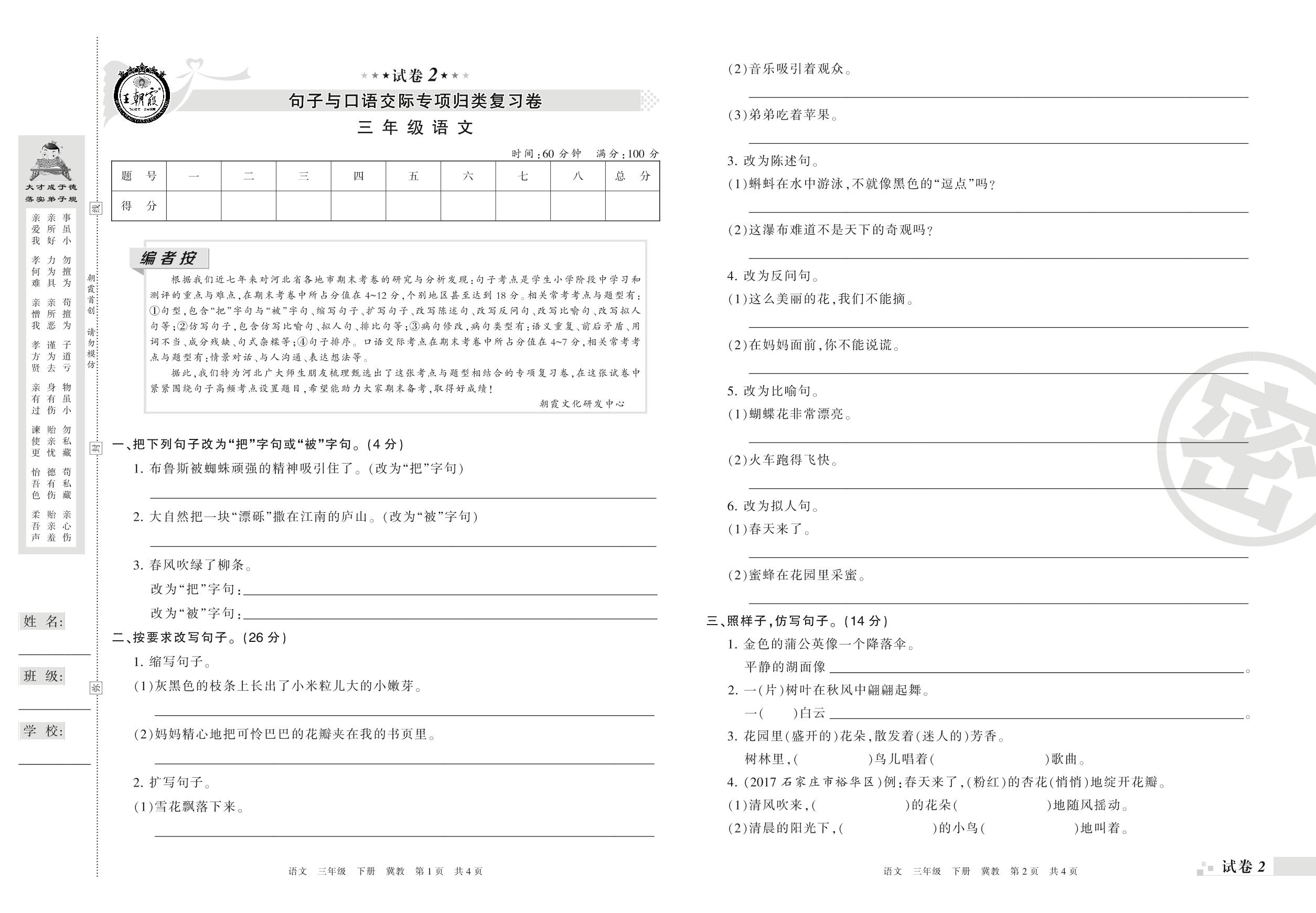 王朝霞期末专项卷——句子与口语交际专项归类复习卷三年级下册语文(冀教版)_R210801104957【2】