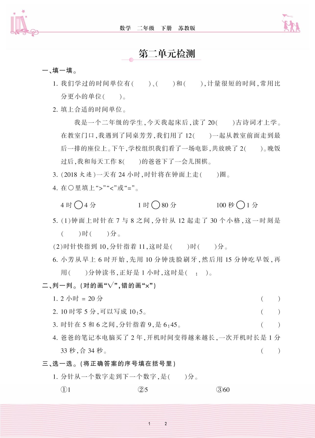 2021下册二年级数学苏教版 二 时、分、秒——第二单元检测