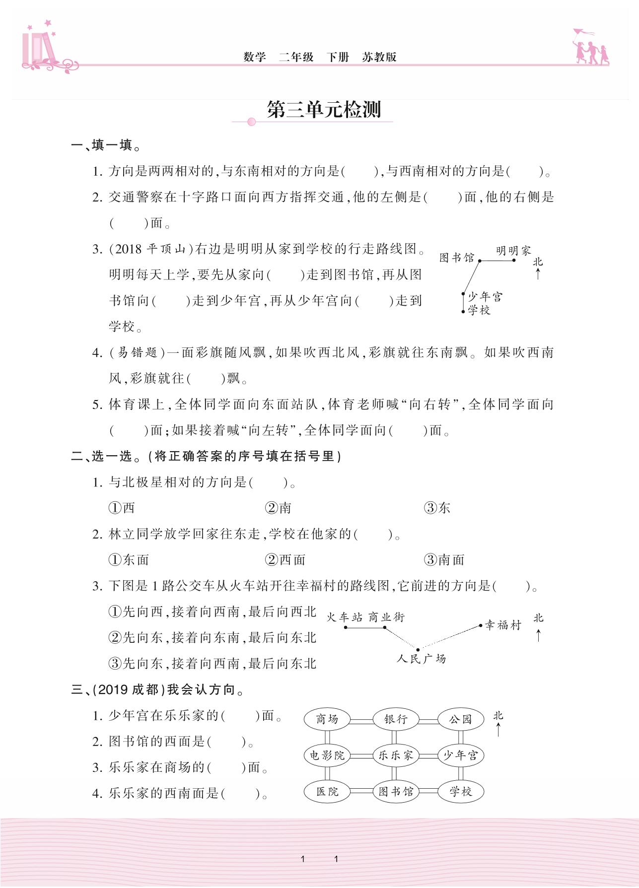2021下册二年级数学苏教版 三 认识方向——第三单元检测
