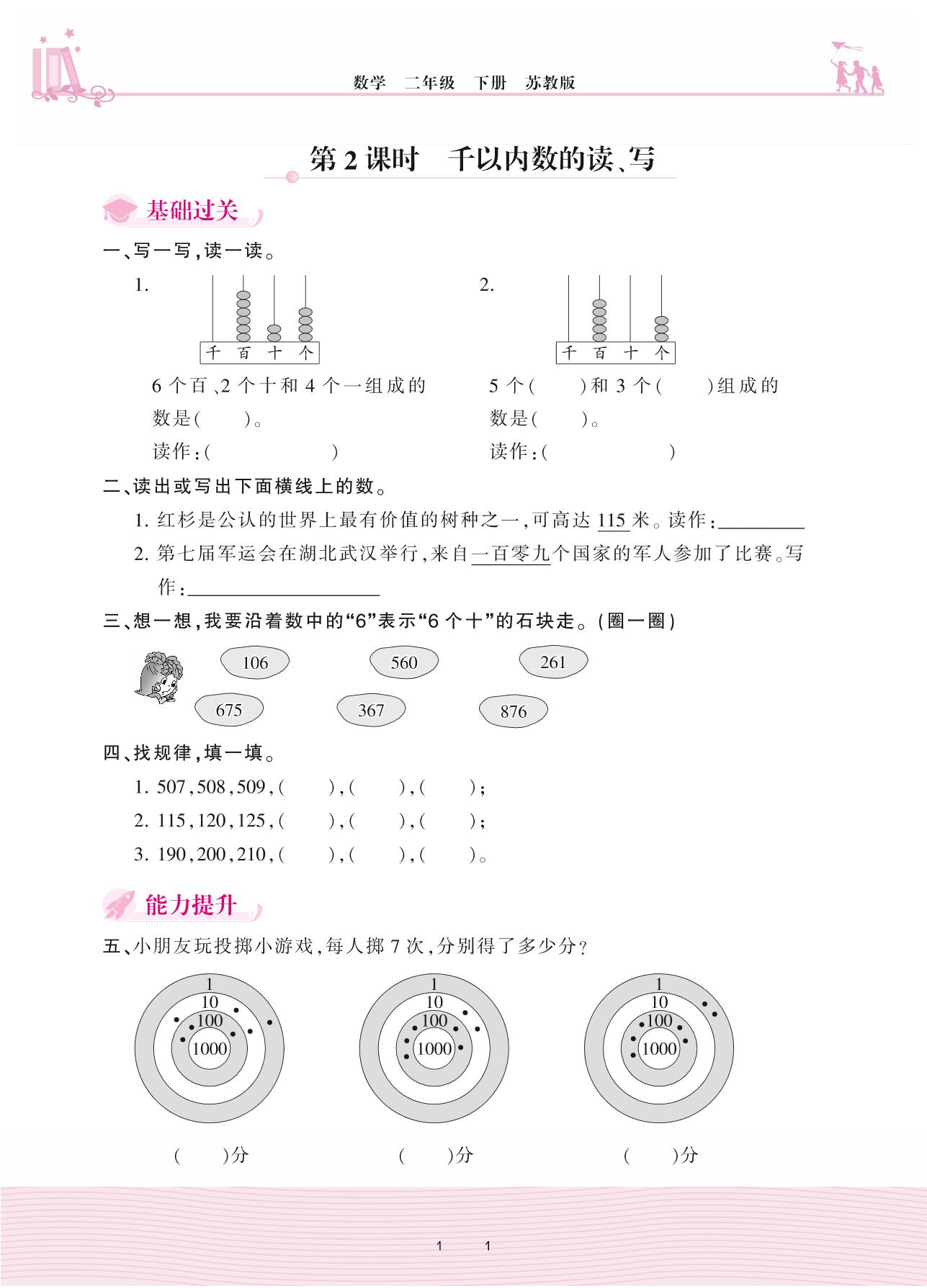 2021下册二年级数学苏教版 四 认识万以内的数——第2课时 千以内数的读、写