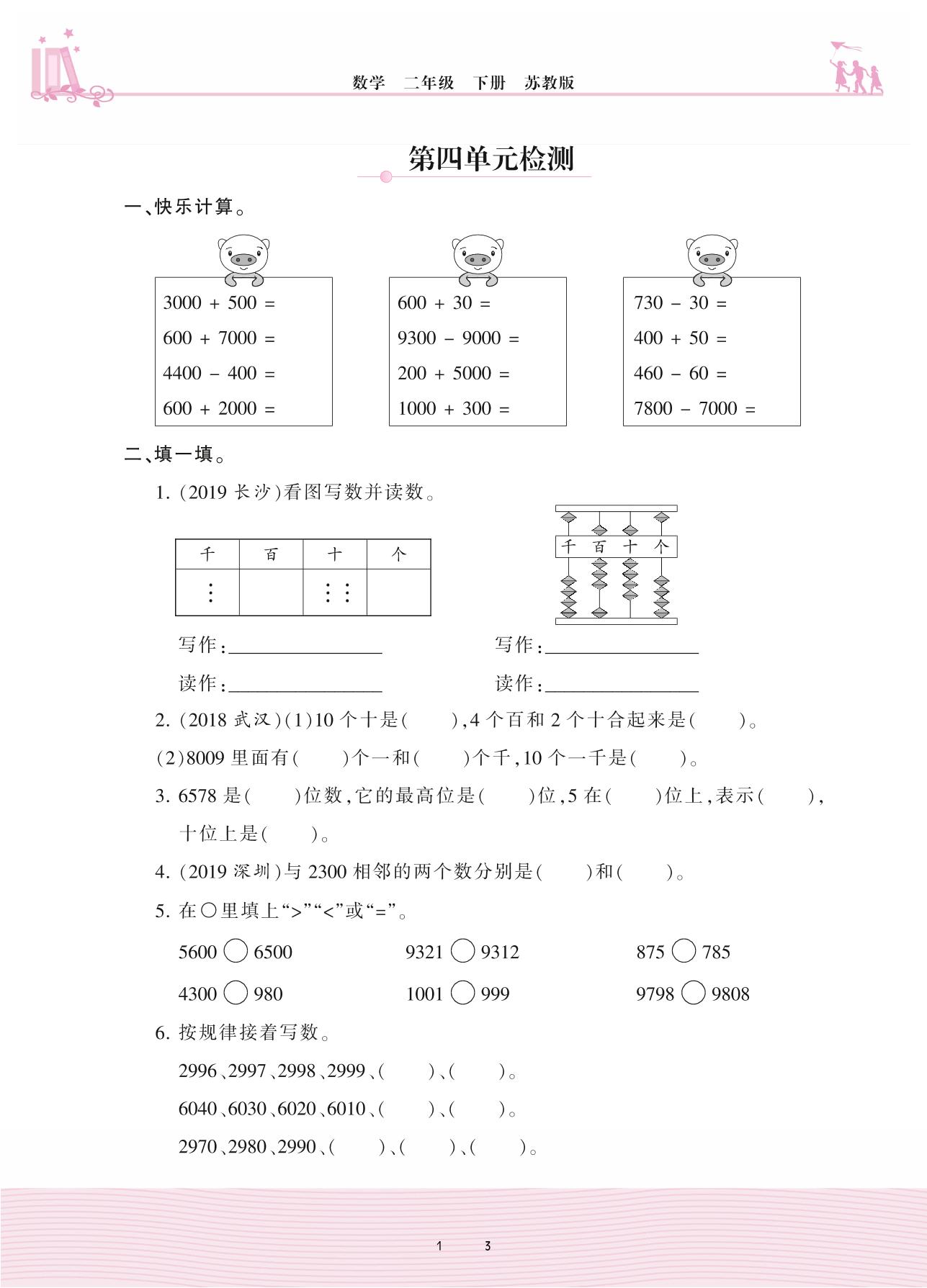 2021下册二年级数学苏教版 四 认识万以内的数——第四单元检测