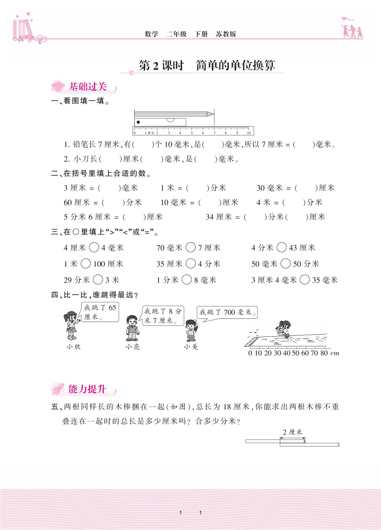 2021下册二年级数学苏教版 五 分米和毫米——第2课时 简单的单位换算