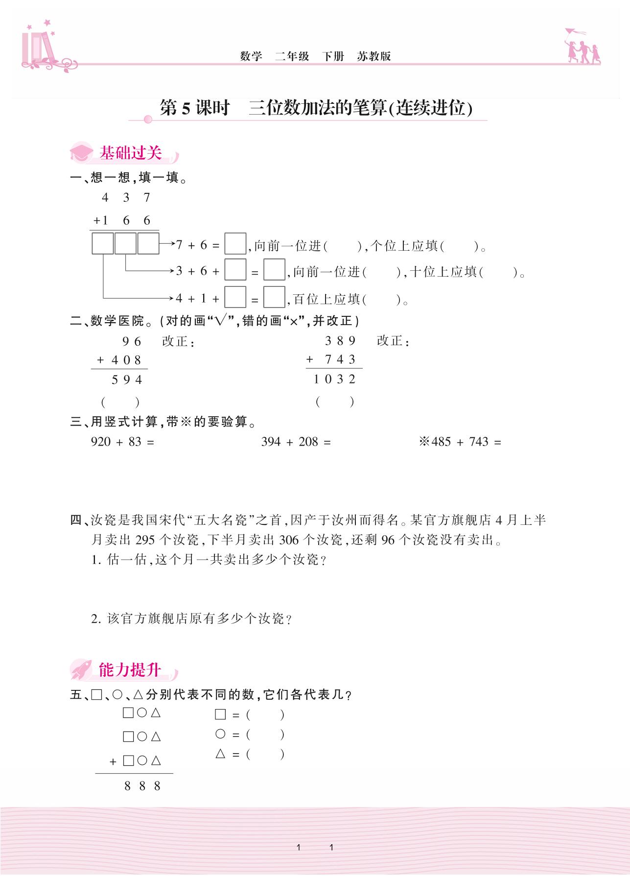 2021下册二年级数学苏教版 六 两、三位数的加法和减法——第5课时 三位数加法的笔算(连续进位)