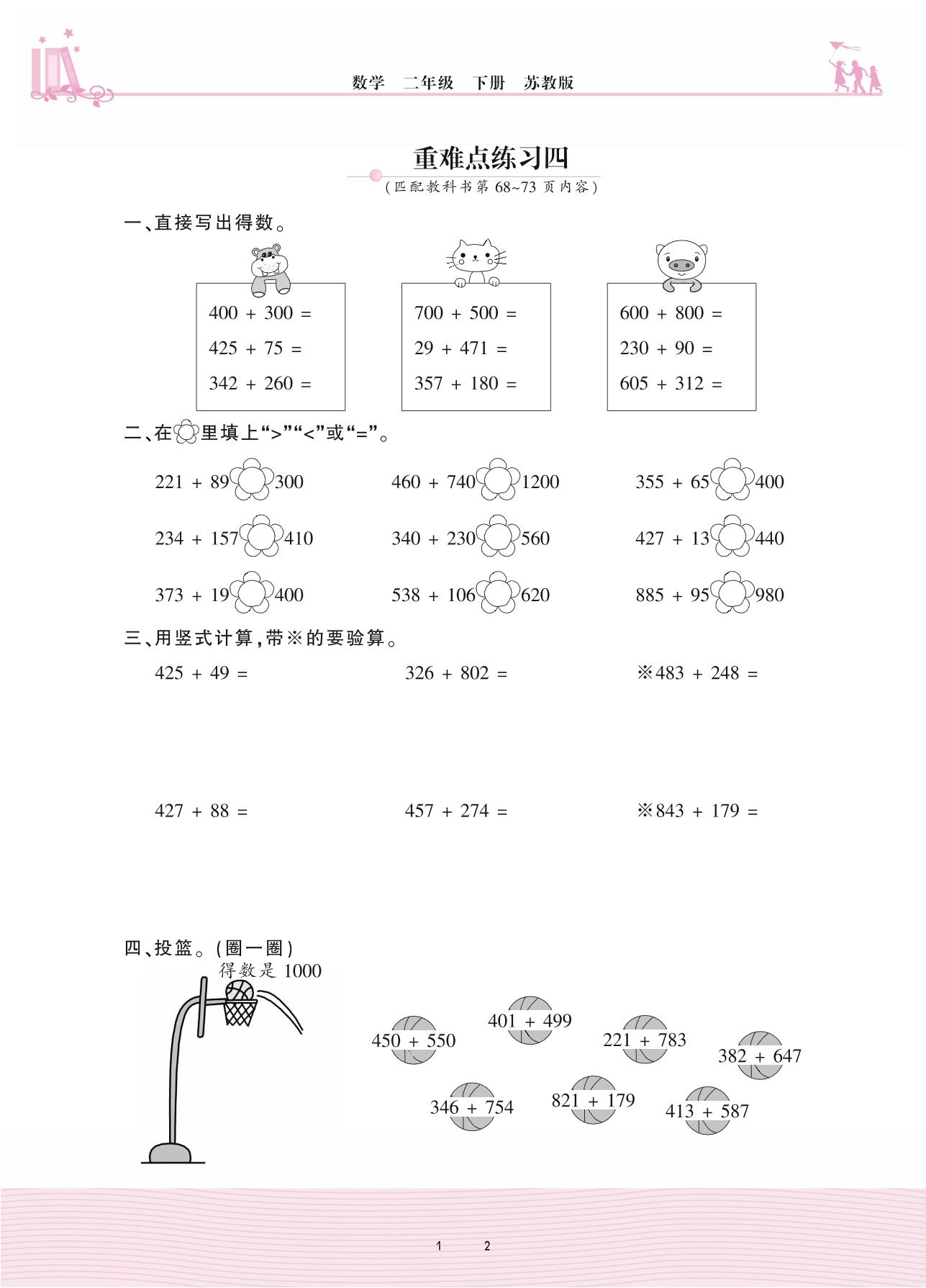 2021下册二年级数学苏教版 六 两、三位数的加法和减法——重难点练习四