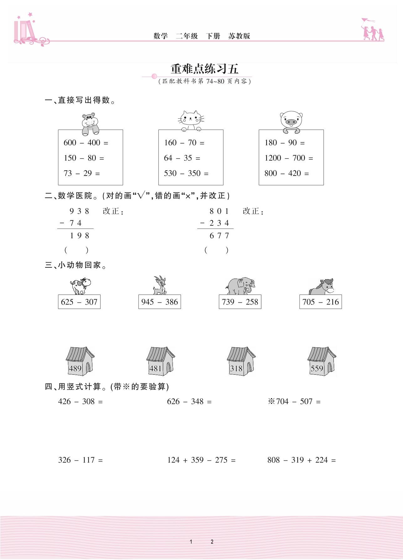 2021下册二年级数学苏教版 六 两、三位数的加法和减法——重难点练习五