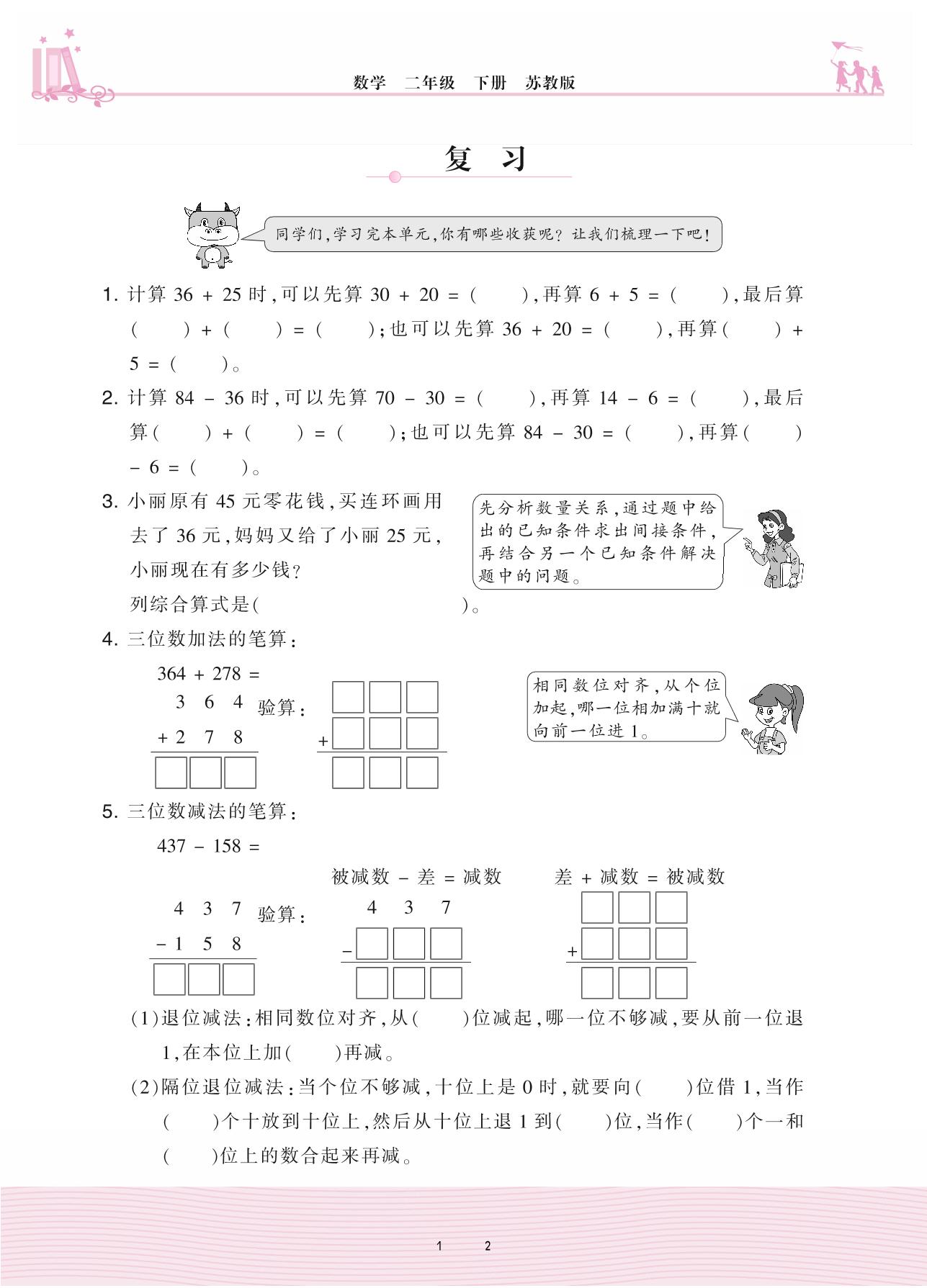 2021下册二年级数学苏教版 六 两、三位数的加法和减法——复习